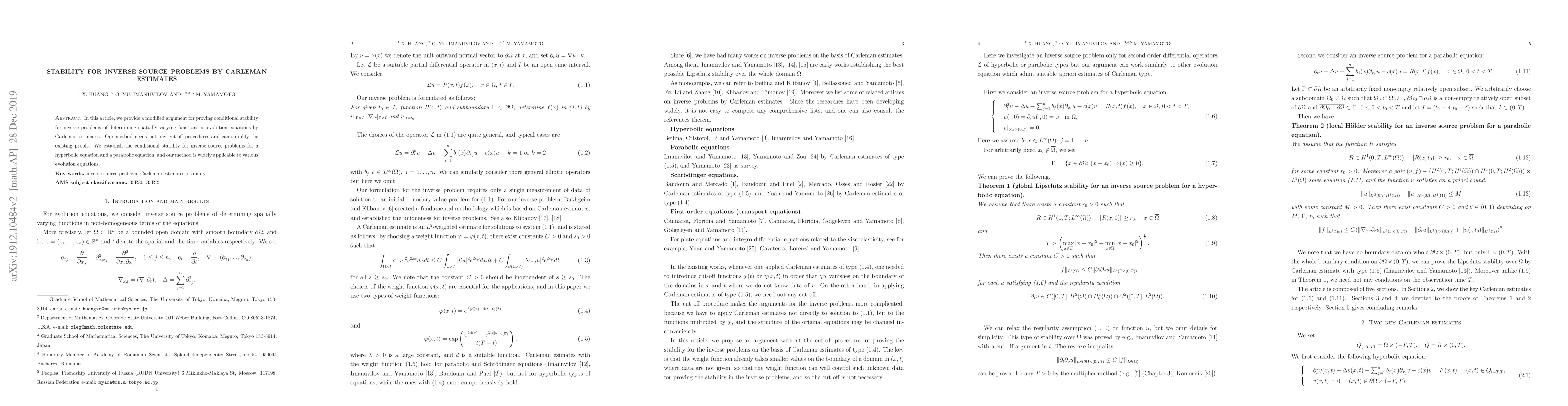 This paper presents a new method using Carleman estimates to prove conditional stability for inverse source problems in evolution equations, without requiring cut-off procedures, and applies this approach to both hyperbolic and parabolic equations. The method is shown to be broadly applicable to various types of evolution equations.