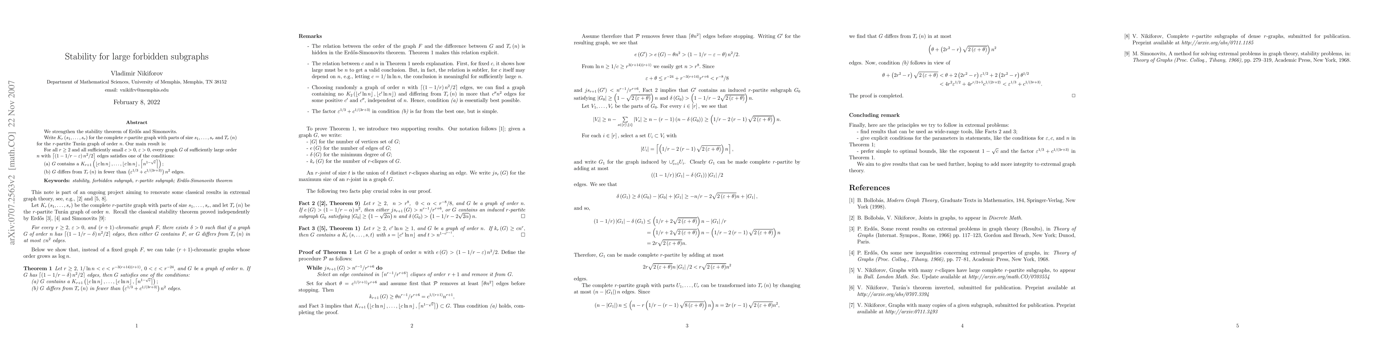 Two-line summary: This paper extends the classical stability theorem of Erdős and Simonovits to include large forbidden subgraphs beyond just logarithmic order, providing new insights into the stability of graph properties. The results demonstrate how the stability phenomenon can be generalized to larger subgraphs, enhancing the understanding of graph theory.