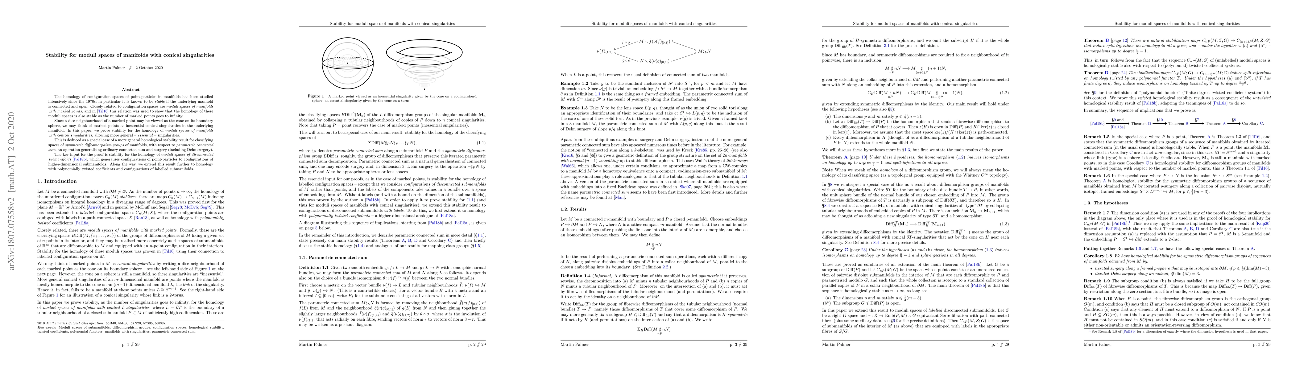 The homology of configuration spaces of point-particles in manifolds has been studied intensively since the 1970s; in particular it is known to be stable if the underlying manifold is connected and open. Closely related to configuration spaces are moduli spaces of manifolds with marked points, and in [Tillmann, 2016] this relation was used to show that the homology of these moduli spaces is also stable as the number of marked points goes to infinity. Since a disc neighbourhood of a marked point may be viewed as the cone on its boundary sphere, we may think of marked points as inessential conical singularities in the underlying manifold. In this paper, we prove stability for the homology of moduli spaces of manifolds with conical singularities, allowing more general -- essential -- singularities. This is deduced as a special case of a more general homological stability result for classifying spaces of symmetric diffeomorphism groups of manifolds, with respect to parametric connected sum, an operation generalising ordinary connected sum and surgery (including Dehn surgery). The key input for the proof is stability for the homology of moduli spaces of disconnected submanifolds [Palmer, 2018], which generalises configurations of point-particles to configurations of higher-dimensional submanifolds. Along the way, we extend this result further to homology with polynomially twisted coefficients and configurations of labelled submanifolds.