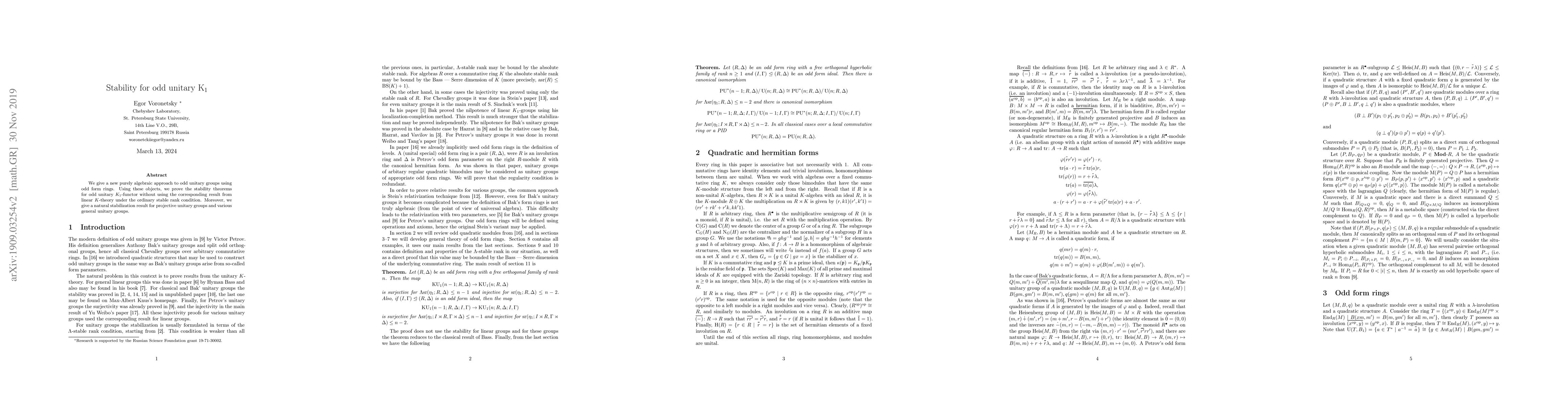 This paper presents a novel algebraic method for studying odd unitary groups through odd form rings, proving stability theorems for the odd unitary $K_1$-functor without relying on linear $K$-theory, and establishing stabilization results for projective and general unitary groups.