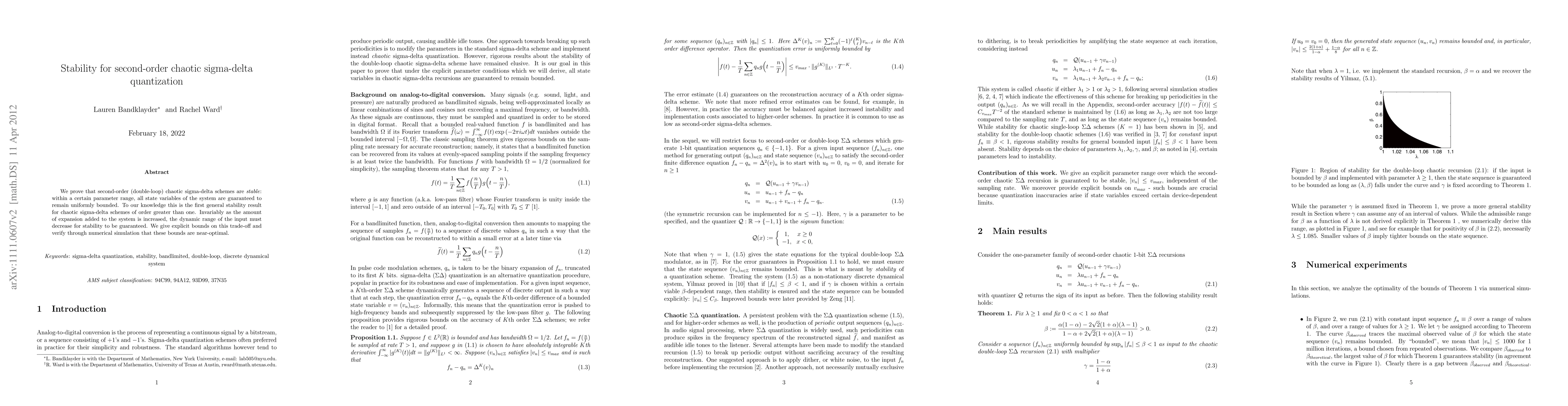 We prove that that second-order (double-loop) chaotic sigma-delta schemes are stable - within a certain parameter range, all state variables of the system are guaranteed to remain uniformly bounded. To our knowledge this is the first general stability result for chaotic sigma-delta schemes of order greater than one. Invariably as the amount of expansion added to the system is increased, the dynamic range of the input must get smaller for stability to be guaranteed. We give explicit bounds on this trade-off and verify through numerical simulation that these bounds are near-optimal.