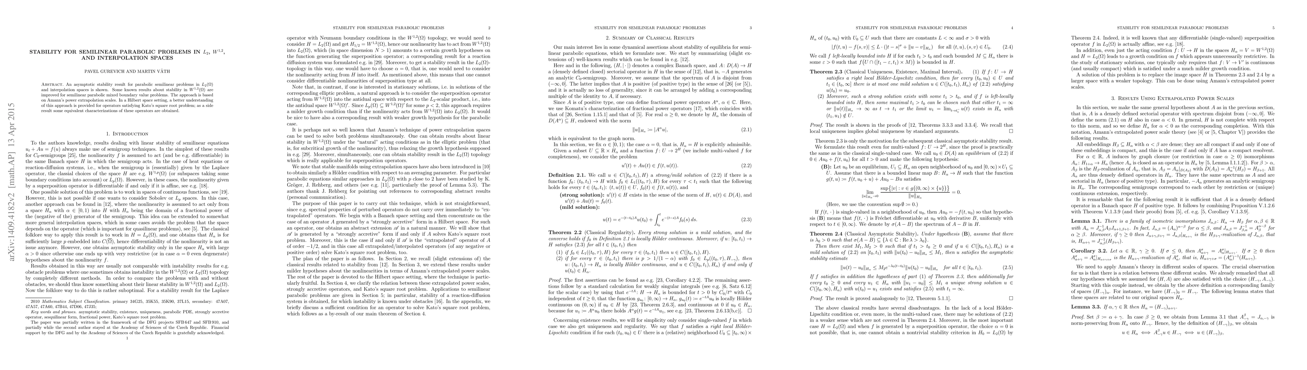 An asymptotic stability result for parabolic semilinear problems in $L_2(\Omega)$ and interpolation spaces is shown. Some known results about stability in $W^{1,2}(\Omega)$ are improved for semilinear parabolic mixed boundary value problems. The approach is based on Amann's power extrapolation scales. In a Hilbert space setting, a better understanding of this approach is provided for operators satisfying Kato's square root problem; as a side result some equivalent characterizations of these operators are obtained.