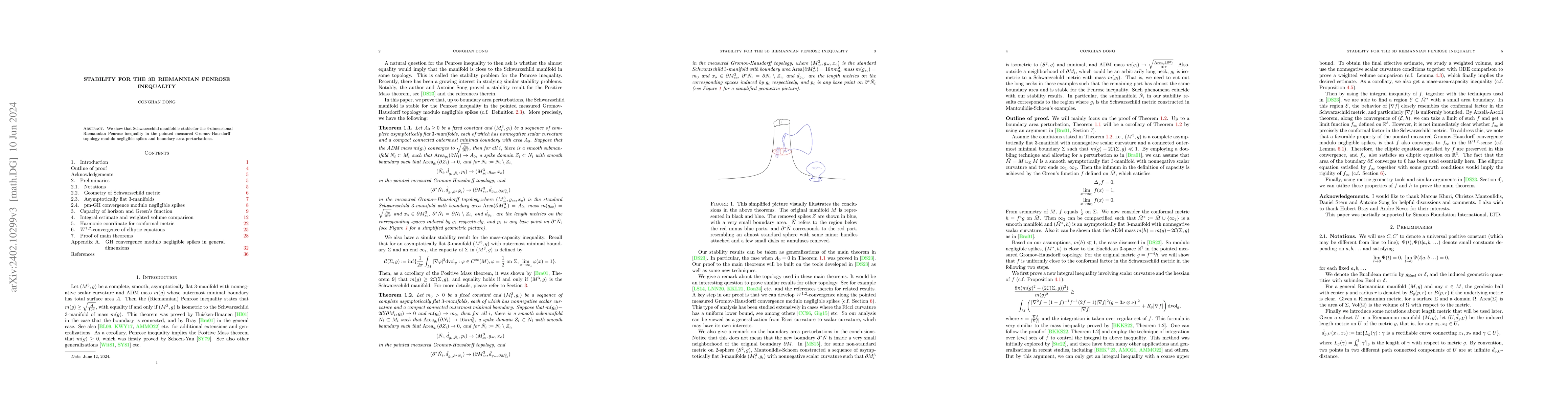 This paper demonstrates the stability of the Schwarzschild manifold concerning the 3D Riemannian Penrose inequality, confirming its robustness against negligible spikes and boundary area changes in the pointed measured Gromov-Hausdorff topology.