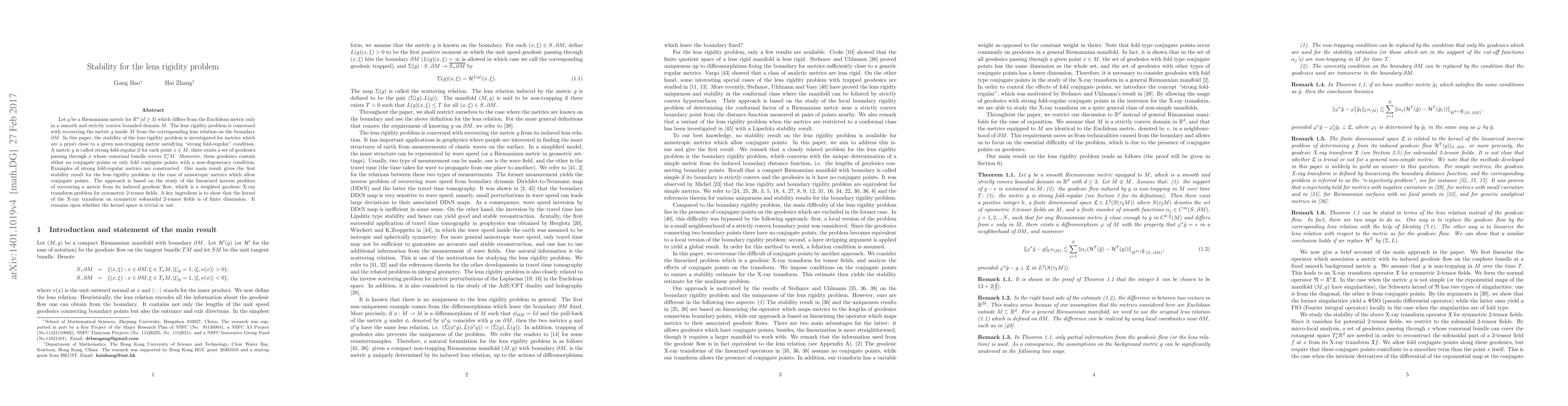 Let $g$ be a Riemannian metric for $\mathbf{R}^d$ ($d\geq 3$) which differs from the Euclidean metric only in a smooth and strictly convex bounded domain $M$. The lens rigidity problem is concerned with recovering the metric $g$ inside $M$ from the corresponding lens relation on the boundary $\partial M$. In this paper, the stability of the lens rigidity problem is investigated for metrics which are a priori close to a given non-trapping metric satisfying "strong fold-regular" condition. A metric $g$ is called strong fold-regular if for each point $x\in M$, there exists a set of geodesics passing through $x$ whose conormal bundle covers $T^*_{x}M$. Moreover, these geodesics contain either no conjugate points or only fold conjugate points with a non-degeneracy condition. Examples of strong fold-regular metrics are constructed and are expected to be generic. Our main result gives the first stability result for the lens rigidity problem in the case of anisotropic metrics which allow conjugate points. The approach is based on the study of the linearized inverse problem of recovering a metric from its induced geodesic flow, which is a weighted geodesic X-ray transform problem for symmetric 2-tensor fields. A key ingredient is to show that the kernel of the X-ray transform on symmetric solenoidal 2-tensor fields is of finite dimension. It remains open whether the kernel space is trivial or not.