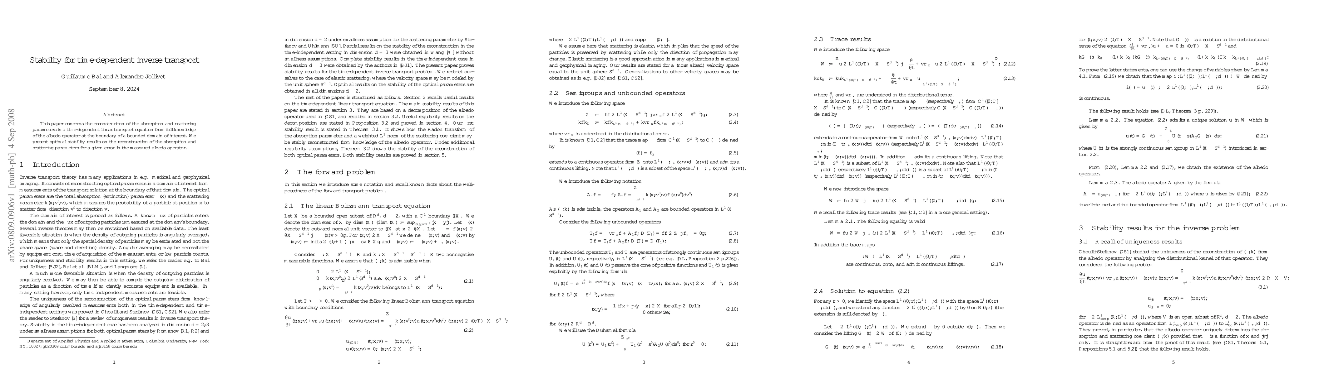 This paper concerns the reconstruction of the absorption and scattering parameters in a time-dependent linear transport equation from full knowledge of the albedo operator at the boundary of a bounded domain of interest. We present optimal stability results on the reconstruction of the absorption and scattering parameters for a given error in the measured albedo operator.