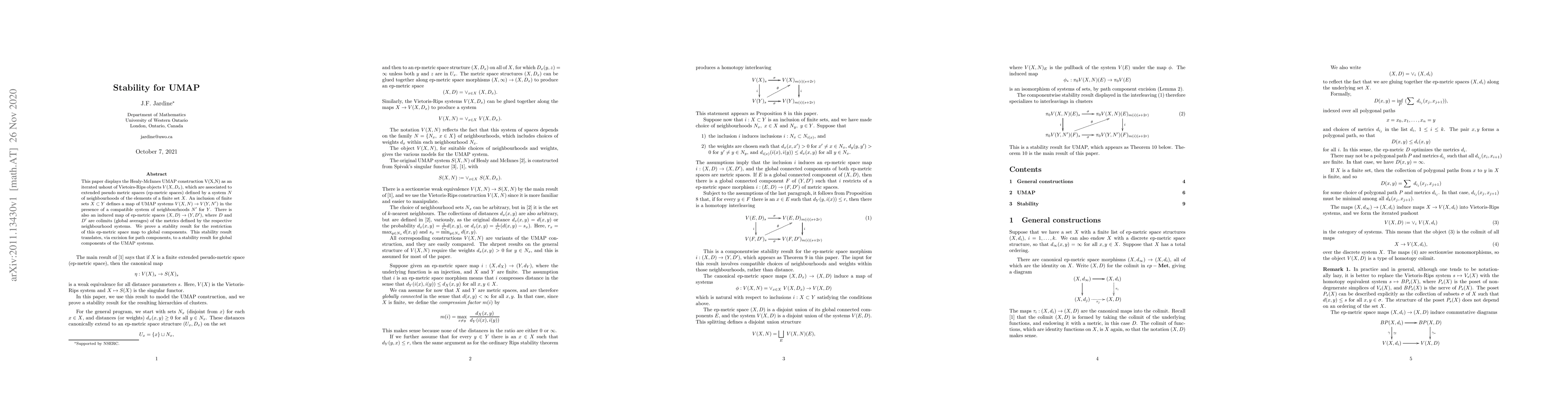 This paper displays the Healy-McInnes UMAP construction $V(X,N)$ as an iterated pushout of Vietoris-Rips objects associated to extended pseudo metric spaces (ep-metric spaces) defined by choices of neighbourhoods of the elements of a finite set $X$. An inclusion $X \subset Y$ in another finite set defines a map of UMAP systems $V(X,N) \to V(Y,N')$ in the presence of a compatible system of neighbourhoods $N'$ for $Y$. There is also an induced map of ep-metric spaces $(X,D) \to (Y,D')$, where $D$ and $D'$ are colimits (global averages) of the metrics defined by the neighbourhood systems for $X$ and $Y$. We prove a stablity result for the restriction of this ep-metric space map to global components. This stability result translates, via excision for path components, to a stability result for global components of the UMAP systems.