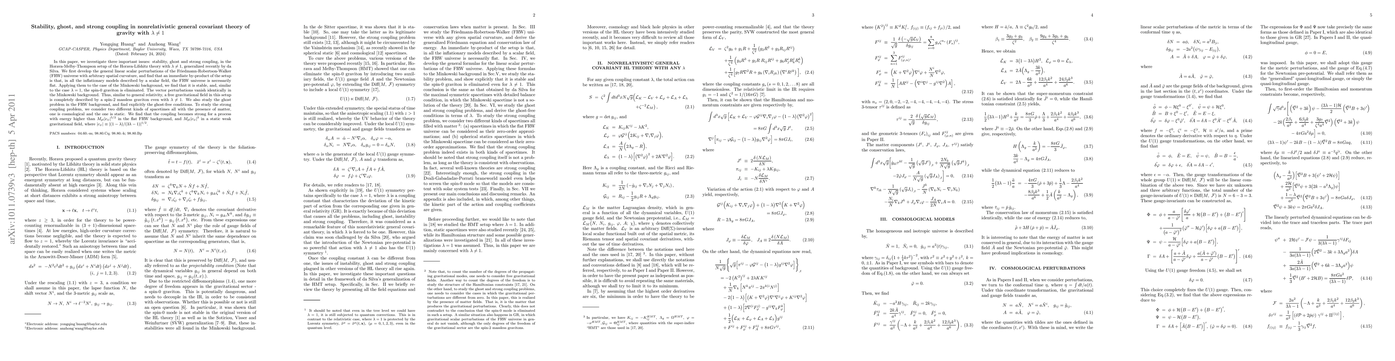 Researchers investigated stability, ghost particles, and strong coupling in a nonrelativistic theory of gravity with variable lambda, finding that the universe is stable and flat, and that a free gravitational field is described by a spin-2 massless graviton, even at high energies.