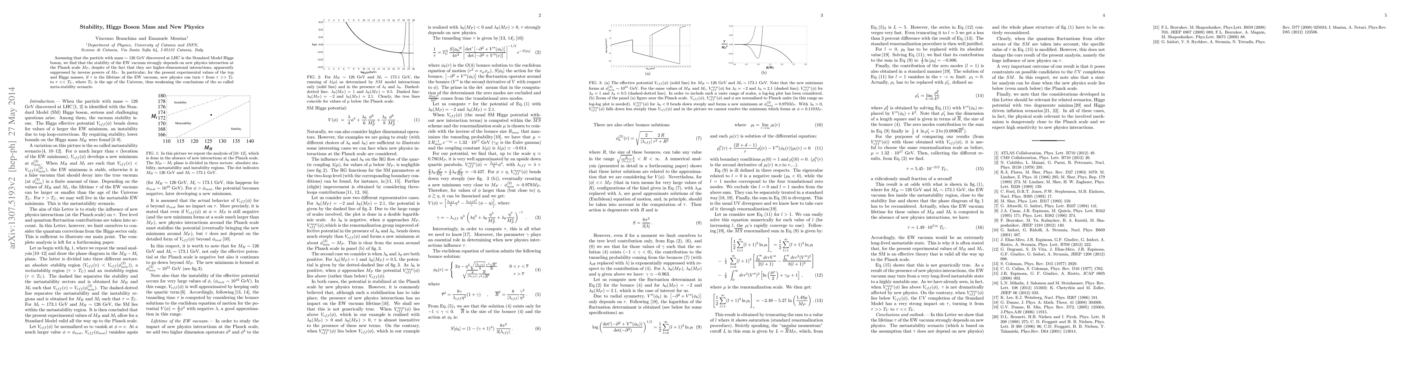 When the particle with mass $\sim 126$ GeV discovered at LHC is identified with the Higgs boson of the Standard Model, intriguing and challenging questions arise. Among them, the issue of the EW vacuum stability. We find that, despite claims to the contrary, the latter strongly depends on new physics interactions. In particular, if $\tau$ is the lifetime of the EW vacuum, new physics can turn $\tau$ from $\tau >> T_U$ to $\tau << T_U$, where $T_U$ is the age of the Universe.