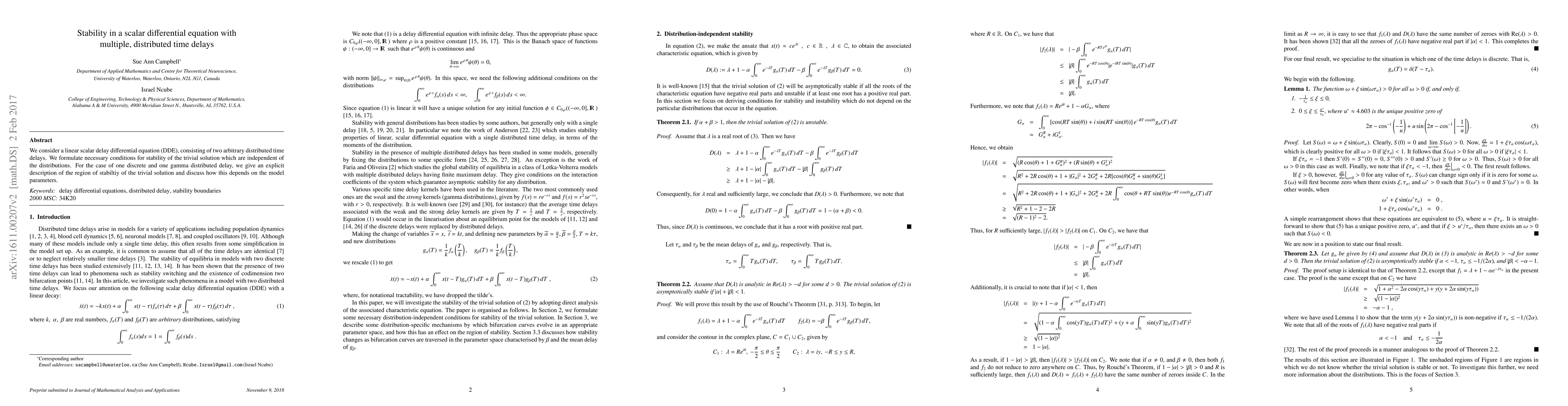 This paper investigates the stability of a linear scalar delay differential equation with two distributed time delays. It establishes necessary stability conditions independent of the delay distributions and provides an explicit stability region for the case of one discrete and one gamma distributed delay, analyzing the dependence on model parameters.