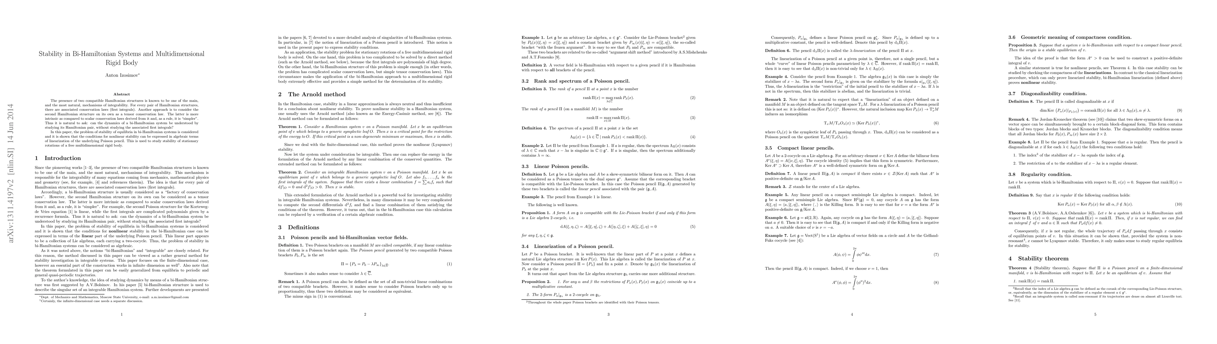 The presence of two compatible Hamiltonian structures is known to be one of the main, and the most natural, mechanisms of integrability. For every pair of Hamiltonian structures, there are associated conservation laws (first integrals). Another approach is to consider the second Hamiltonian structure on its own as a tensor conservation law. The latter is more intrinsic as compared to scalar conservation laws derived from it and, as a rule, it is "simpler". Thus it is natural to ask: can the dynamics of a bi-Hamiltonian system be understood by studying its Hamiltonian pair, without studying the associated first integrals?\par In this paper, the problem of stability of equilibria in bi-Hamiltonian systems is considered and it is shown that the conditions for nonlinear stability can be expressed in algebraic terms of linearization of the underlying Poisson pencil. This is used to study stability of stationary rotations of a free multidimensional rigid body.