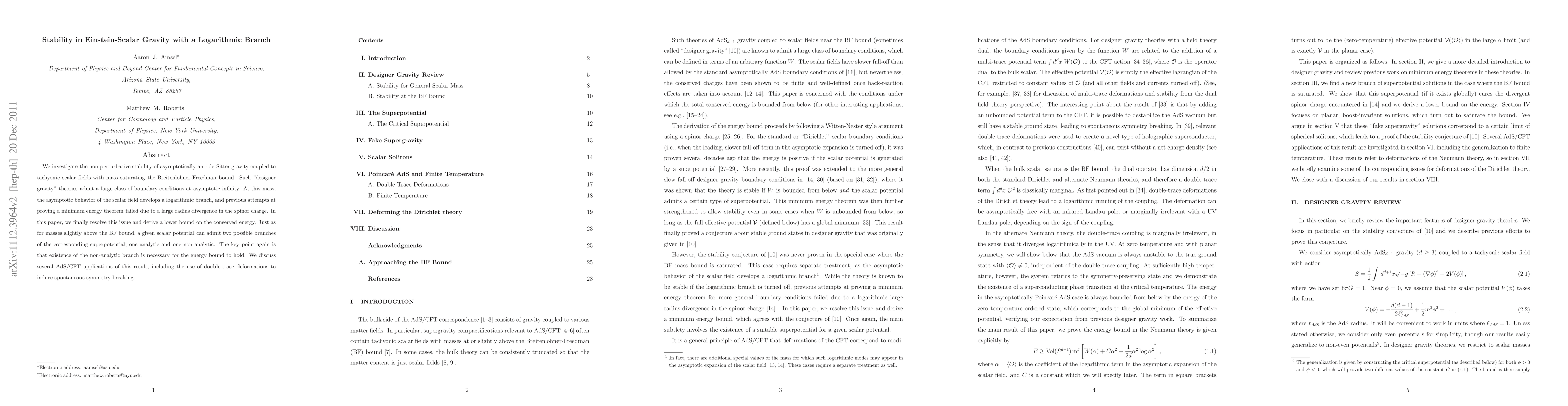 We investigate the non-perturbative stability of asymptotically anti-de Sitter gravity coupled to tachyonic scalar fields with mass saturating the Breitenlohner-Freedman bound. Such "designer gravity" theories admit a large class of boundary conditions at asymptotic infinity. At this mass, the asymptotic behavior of the scalar field develops a logarithmic branch, and previous attempts at proving a minimum energy theorem failed due to a large radius divergence in the spinor charge. In this paper, we finally resolve this issue and derive a lower bound on the conserved energy. Just as for masses slightly above the BF bound, a given scalar potential can admit two possible branches of the corresponding superpotential, one analytic and one non-analytic. The key point again is that existence of the non-analytic branch is necessary for the energy bound to hold. We discuss several AdS/CFT applications of this result, including the use of double-trace deformations to induce spontaneous symmetry breaking.