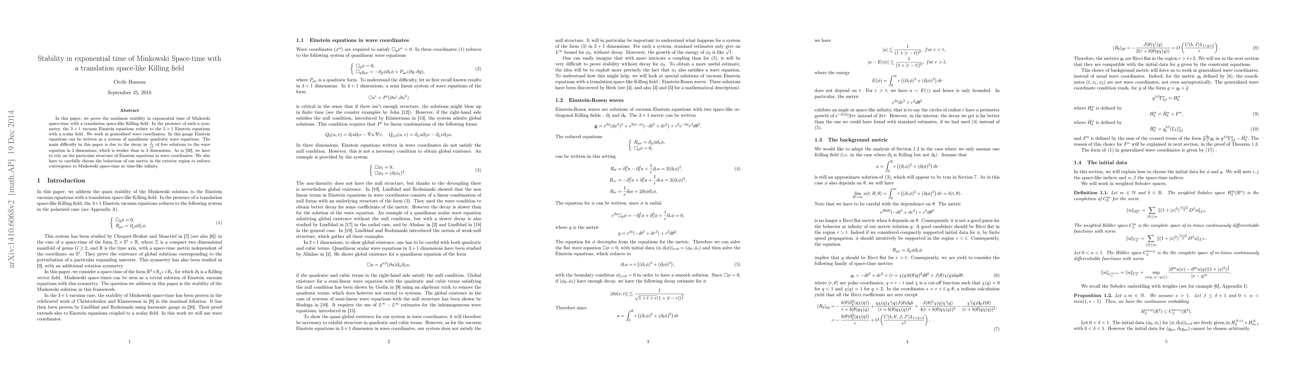This paper proves the exponential time stability of Minkowski space-time with a translation space-like Killing field, reducing the 3+1 vacuum Einstein equations to 2+1 equations with a scalar field. The authors address the weaker decay of solutions in 2 dimensions by leveraging the structure of the Einstein equations in wave coordinates and carefully defining the metric behavior to ensure convergence to Minkowski space-time.