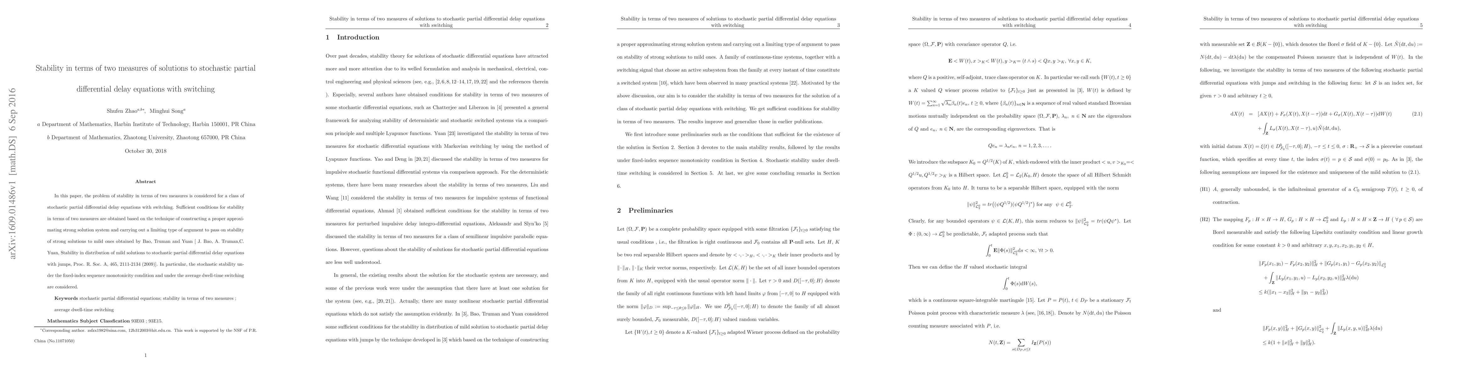This paper investigates stability in terms of two measures for stochastic partial differential delay equations with switching. Sufficient conditions for stability are derived using a strong solution system and a limiting argument, focusing on stochastic stability under fixed-index sequence monotonicity and average dwell-time switching.