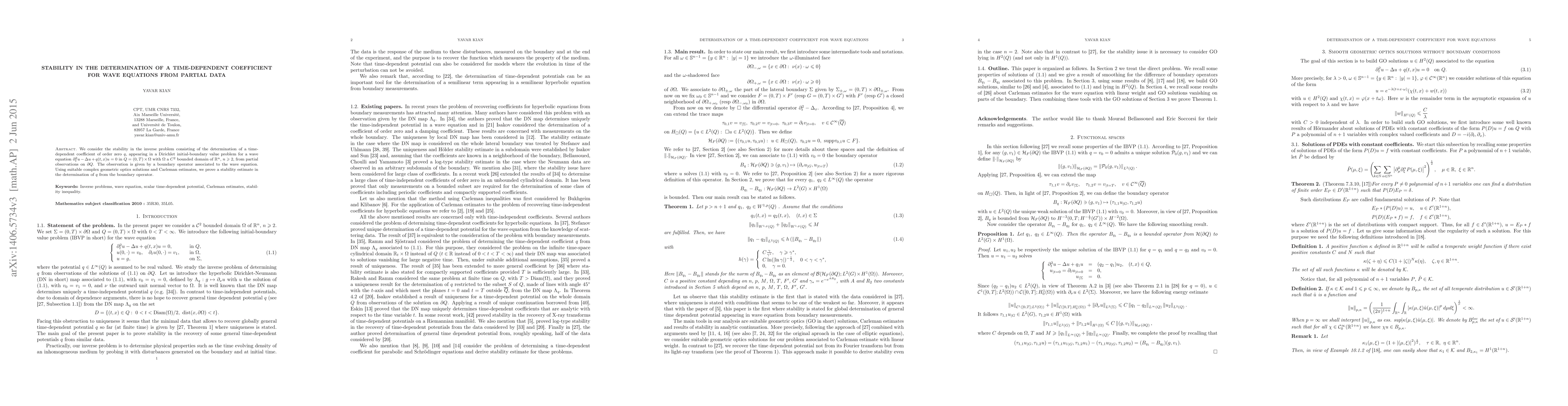 This research paper investigates the stability of determining a time-dependent coefficient in a wave equation from partial data, using complex geometric optics solutions and Carleman estimates to prove a stability estimate for the coefficient.