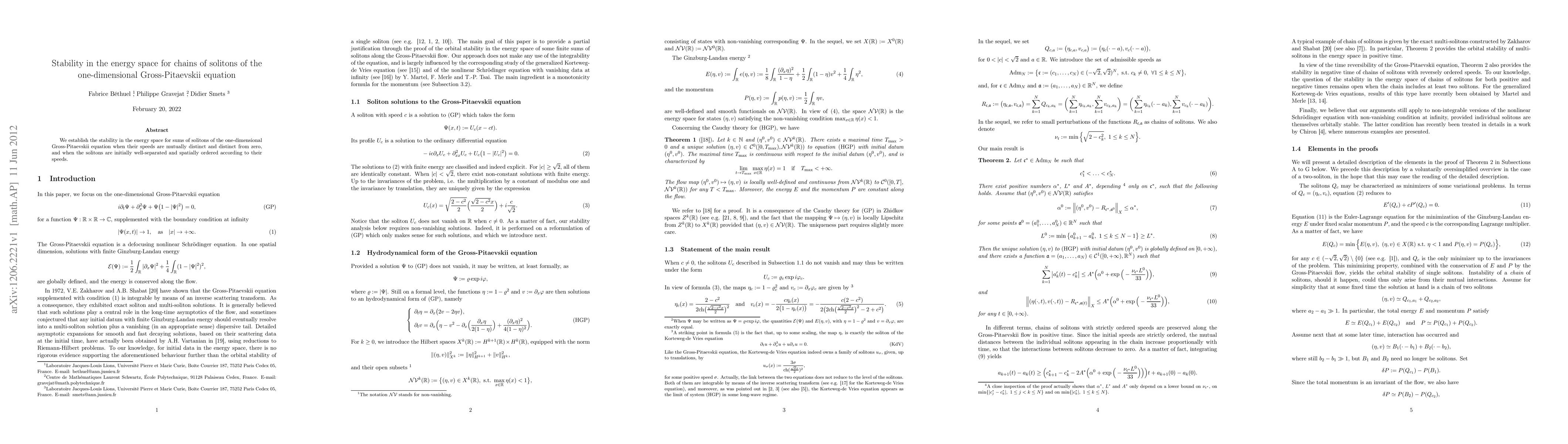 This paper proves the stability in the energy space for chains of solitons in the one-dimensional Gross-Pitaevskii equation, provided the solitons have distinct, non-zero speeds and are initially well-separated and ordered by these speeds. The results demonstrate that these soliton chains maintain their structure over time.