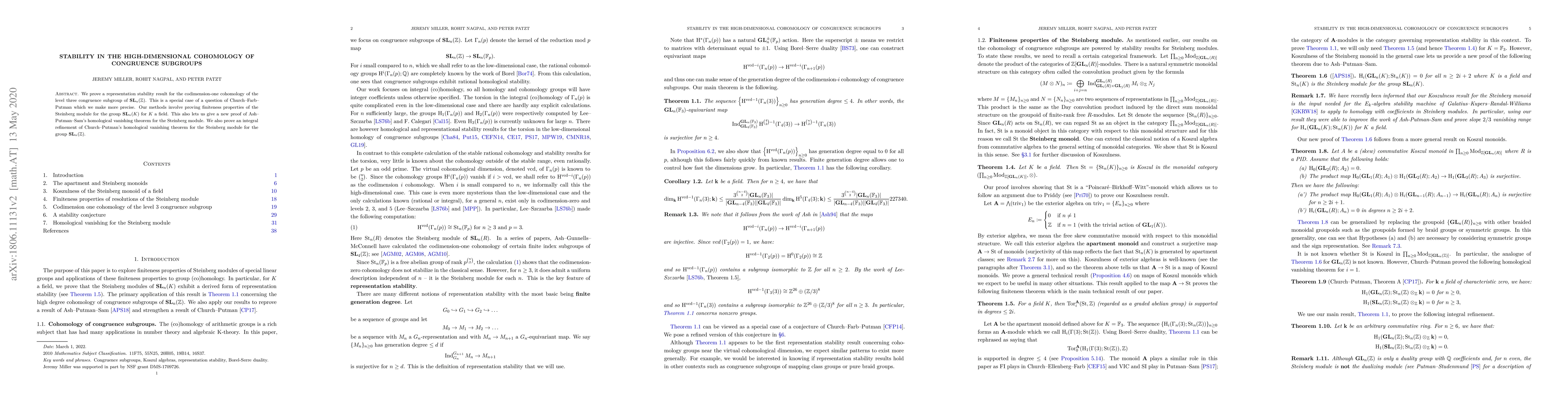 We prove a representation stability result for the codimension-one cohomology of the level three congruence subgroup of $\mathbf{SL}_n(\mathbb{Z})$. This is a special case of a question of Church-Farb-Putman which we make more precise. Our methods involve proving several finiteness properties of the Steinberg module for the group $\mathbf{SL}_n(K)$ for $K$ a field. This also lets us give a new proof of Ash-Putman-Sam's homological vanishing theorem for the Steinberg module. We also prove an integral refinement of Church-Putman's homological vanishing theorem for the Steinberg module for the group $\mathbf{SL}_n(\mathbb{Z})$.