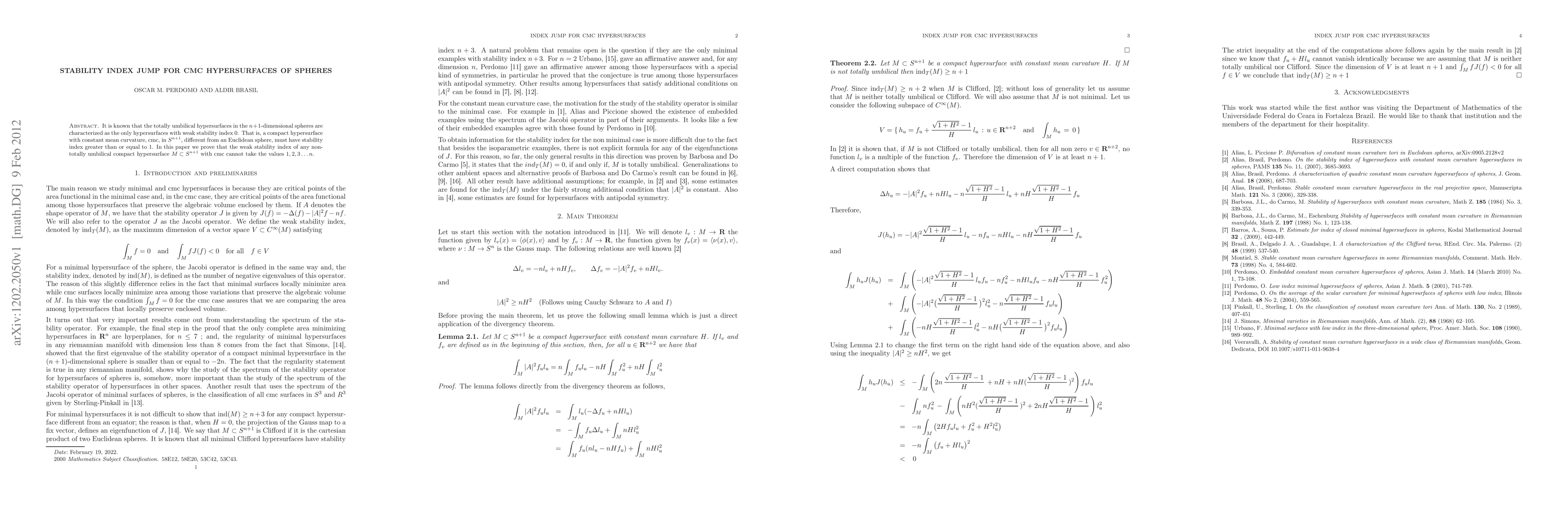This paper proves that for compact hypersurfaces of constant mean curvature (cmc) in spheres, the weak stability index cannot be 1, 2, ..., n, except for totally umbilical hypersurfaces. This reveals a jump in stability index for such hypersurfaces.