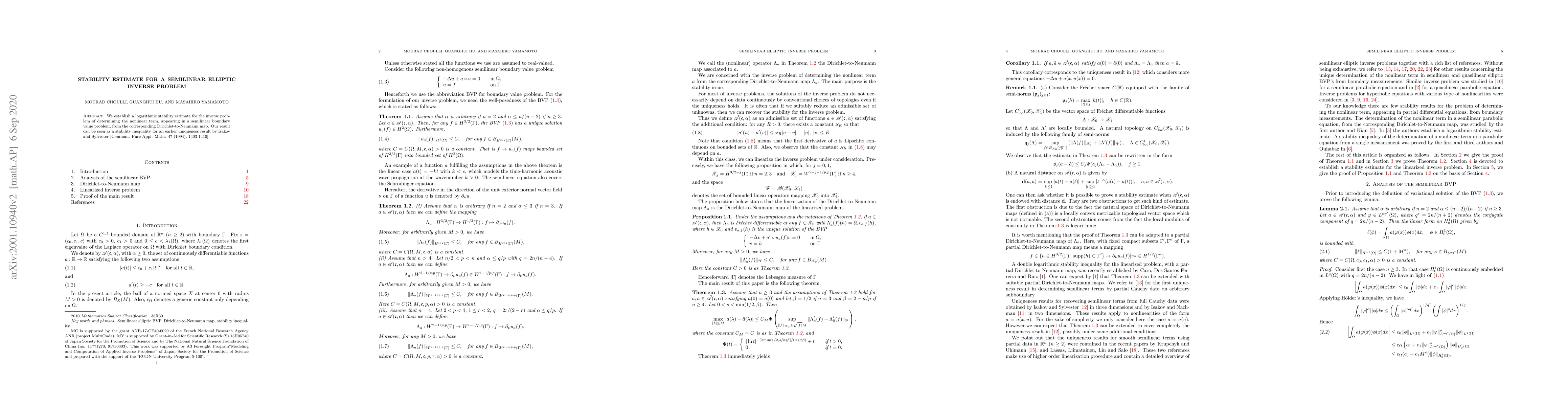 This paper establishes a logarithmic stability inequality for determining the nonlinear term in a semilinear boundary value problem from its Dirichlet-to-Neumann map, extending the stability results of Isakov and Sylvester (1994).