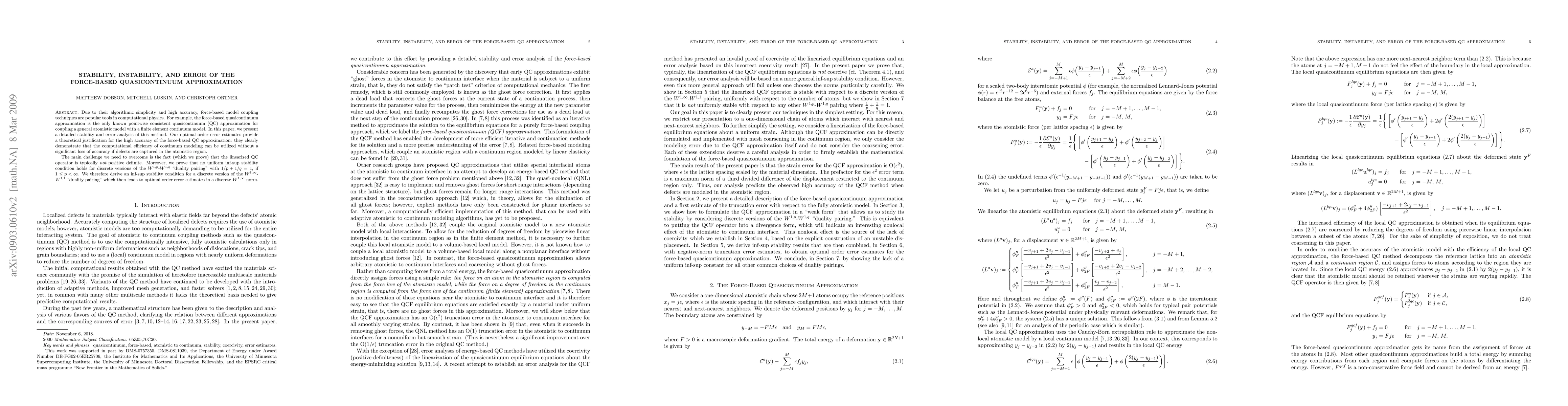 This paper analyzes the stability of the force-based quasicontinuum approximation, proving that the linearized operator is typically non-positive definite. It derives an inf-sup stability condition for a discrete $W^{1,\infty}$-$W^{1,1}$ duality pairing, leading to optimal error estimates and justifying the method's high accuracy and computational efficiency.