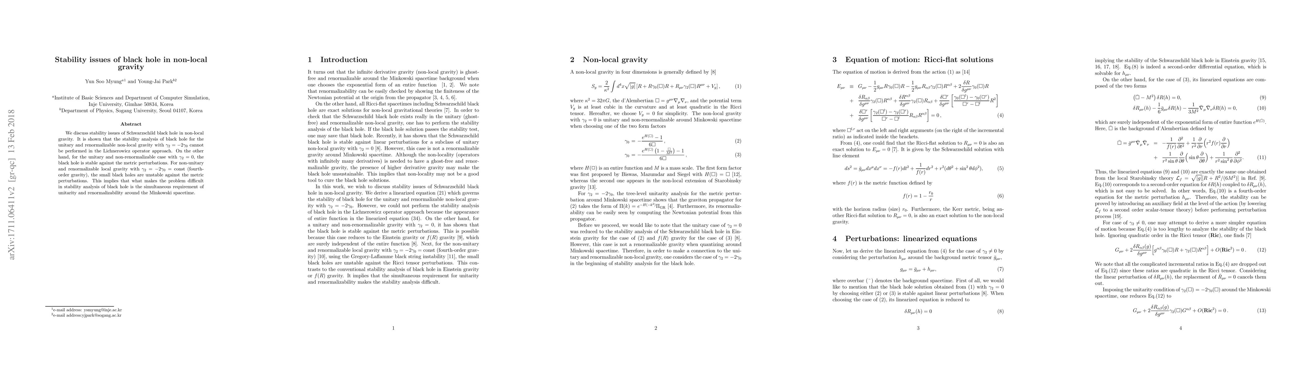 We discuss stability issues of Schwarzschild black hole in non-local gravity. It is shown that the stability analysis of black hole for the unitary and renormalizable non-local gravity with $\gamma_2=-2\gamma_0$ cannot be performed in the Lichnerowicz operator approach. On the other hand, for the unitary and non-renormalizable case with $\gamma_2=0$, the black hole is stable against the metric perturbations. For non-unitary and renormalizable local gravity with $\gamma_2=-2\gamma_0={\rm const}$ (fourth-order gravity), the small black holes are unstable against the metric perturbations. This implies that what makes the problem difficult in stability analysis of black hole is the simultaneous requirement of unitarity and renormalizability around the Minkowski spacetime.
