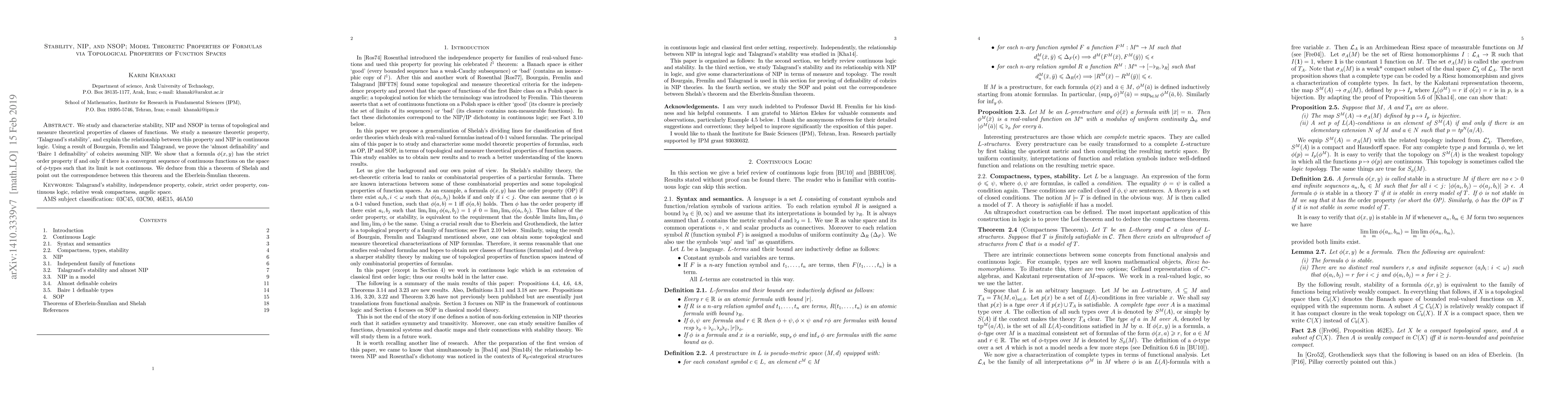 This paper explores the model-theoretic properties of formulas through the lens of topological and measure-theoretic properties of function spaces, establishing connections between stability, NIP, and NSOP. It links Talagrand's stability to NIP in continuous logic and proves the "almost definability" and "Baire 1 definability" of coheirs under NIP, revealing a strict order property equivalence involving convergent sequences of continuous functions.