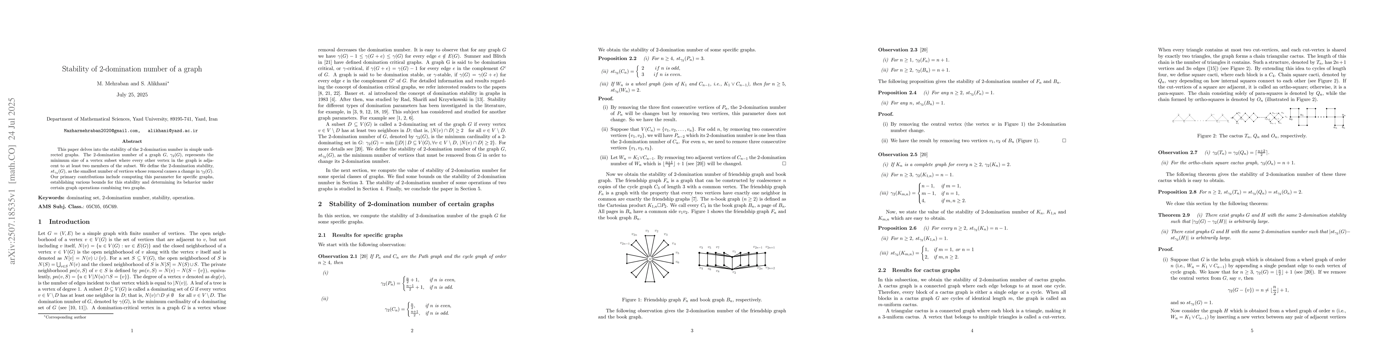 This paper delves into the stability of the $2$-domination number in simple undirected graphs. The $2$-domination number of a graph $G$, $\gamma_2(G)$, represents the minimum size of a vertex subset where every other vertex in the graph is adjacent to at least two members of the subset. We define the $2$-domination stability, $st_{\gamma_2}(G)$, as the smallest number of vertices whose removal causes a change in $\gamma_2(G)$. Our primary contributions include computing this parameter for specific graphs, establishing various bounds for this stability and determining its behavior under certain graph operations combining two graphs.