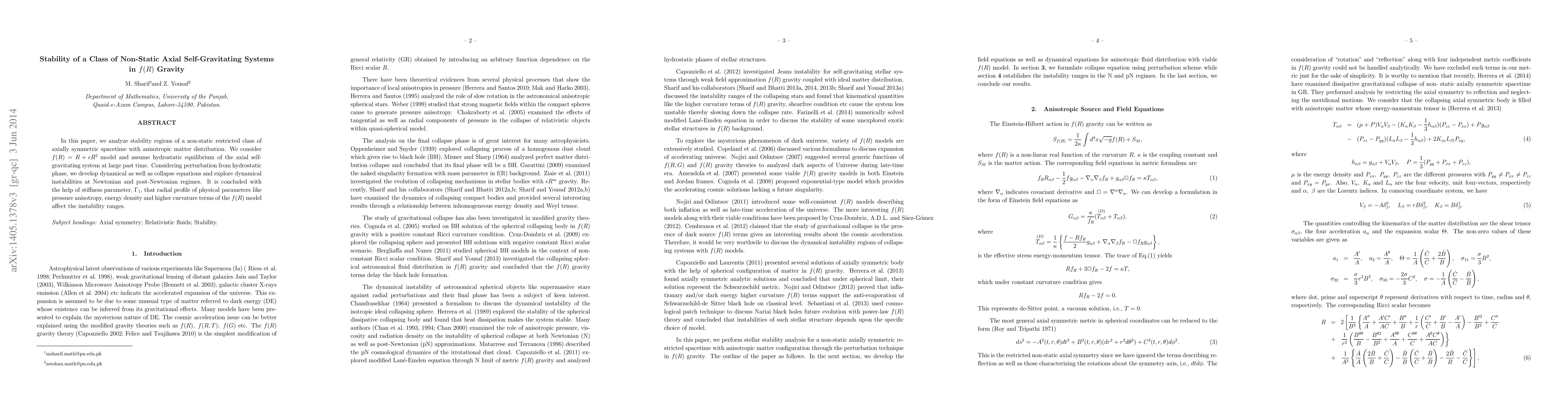 In this paper, we analyze stability regions of a non-static restricted class of axially symmetric spacetime with anisotropic matter distribution. We consider $f(R)=R+{\epsilon}R^2$ model and assume hydrostatic equilibrium of the axial self-gravitating system at large past time. Considering perturbation from hydrostatic phase, we develop dynamical as well as collapse equations and explore dynamical instabilities at Newtonian and post-Newtonian regimes. It is concluded with the help of stiffness parameter, $\Gamma_1$, that radial profile of physical parameters like pressure anisotropy, energy density and higher curvature terms of the $f(R)$ model affect the instability ranges.