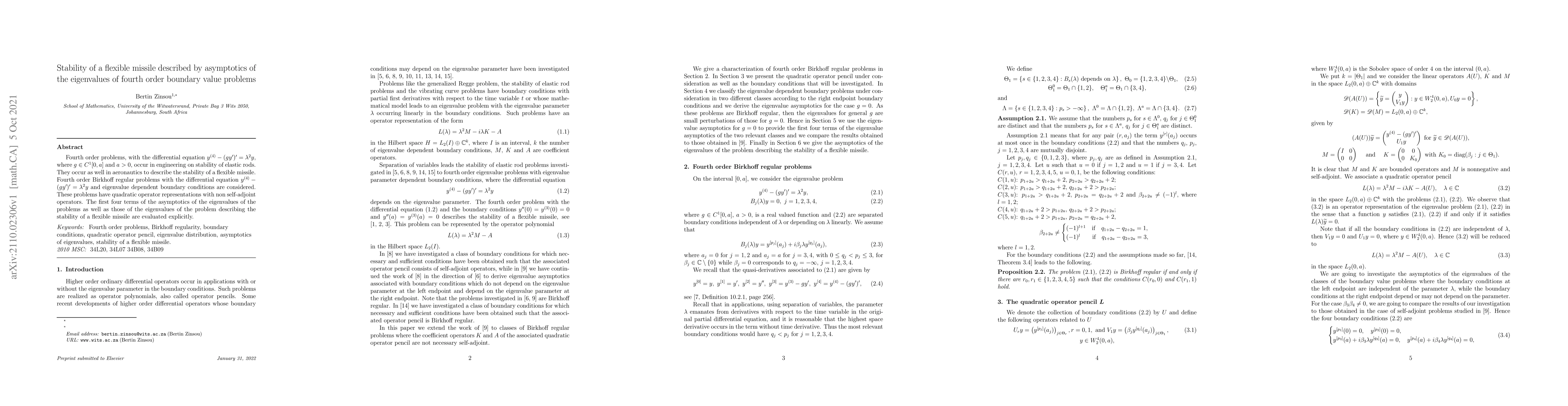 This paper investigates the stability of a flexible missile by analyzing the asymptotics of eigenvalues for fourth-order boundary value problems. The study focuses on non-self-adjoint operators and explicitly evaluates the first four terms of the eigenvalue asymptotics for both general and missile-specific problems.