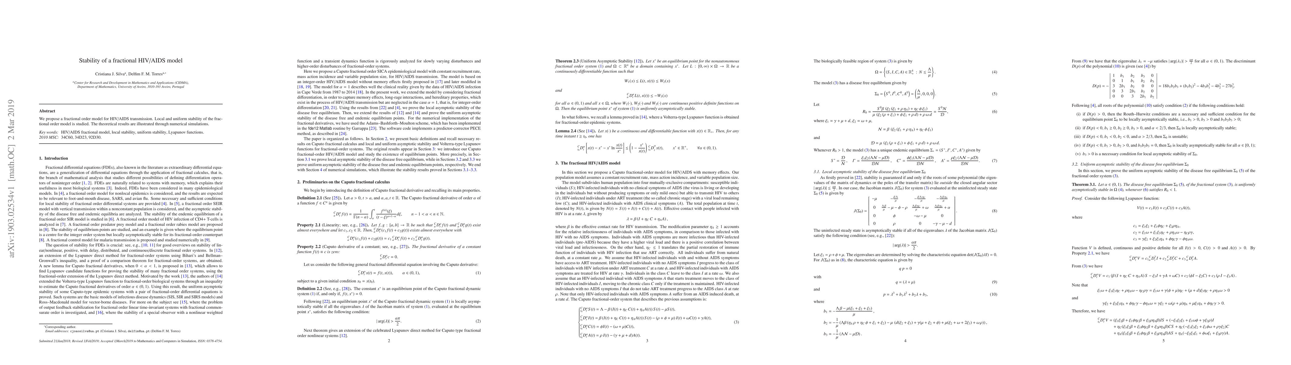 We propose a fractional order model for HIV/AIDS transmission. Local and uniform stability of the fractional order model is studied. The theoretical results are illustrated through numerical simulations.
