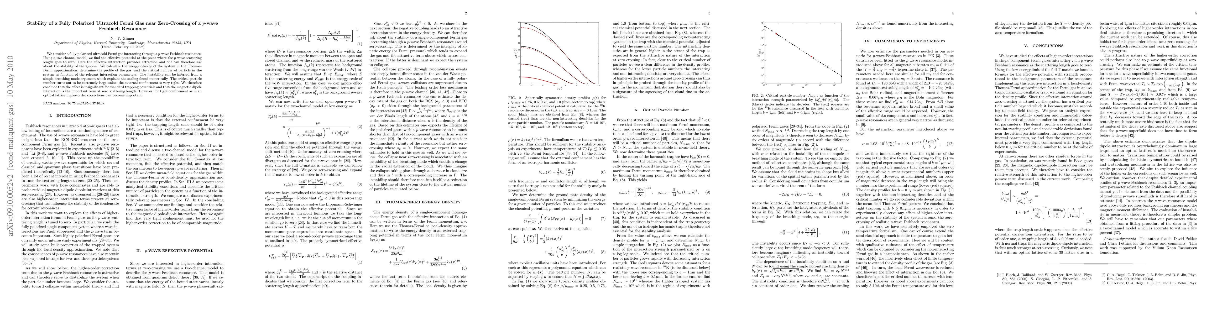 We consider a fully polarized ultracold Fermi gas interacting through a p-wave Feshbach resonance. Using a two-channel model, we find the effective potential at the point where the p-wave scattering length goes to zero. Here the effective interaction provides attraction and one can therefore ask about the stability of the system. We calculate the energy density of the system in the Thomas-Fermi approximation, determine the profile of the gas, and the critical number of particle in the system as function of the relevant interaction parameters. The instability can be deduced from a simple breathing mode argument which explains the scaling found numerically. The critical particle number turns out to be extremely large unless the external confinement is very tight. We therefore conclude that the effect is insignificant for standard trapping potentials and that the magnetic dipole interaction is the important term at zero scattering length. However, for tight confinement as in an optical lattice higher-order corrections can become important.