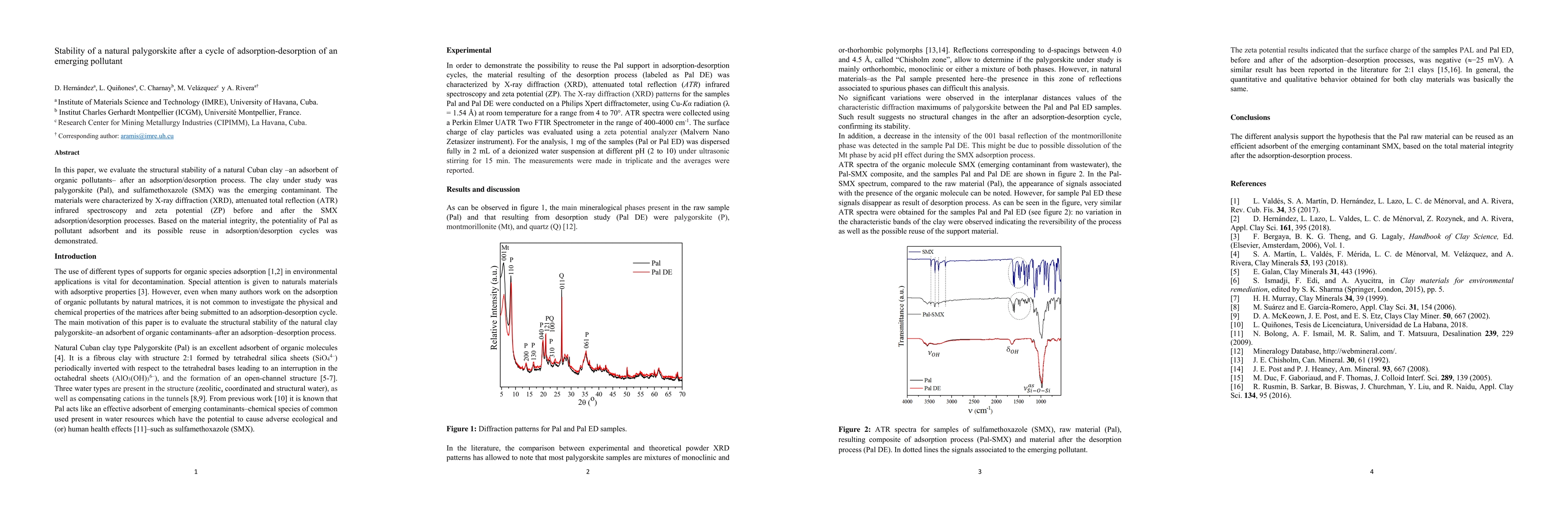 In this paper, we evaluate the structural stability of a natural Cuban clay (an adsorbent of organic pollutants) after an adsorption-desorption process. The clay under study was palygorskite, and sulfamethoxazole was the emerging contaminant. The materials were characterized by X-ray diffraction, attenuated total reflection infrared spectroscopy and zeta potential before and after the sulfamethoxazole adsorption-desorption processes. Based on the material integrity, the potentiality of Pal as pollutant adsorbent and its possible reuse in adsorption-desorption cycles was demonstrated.