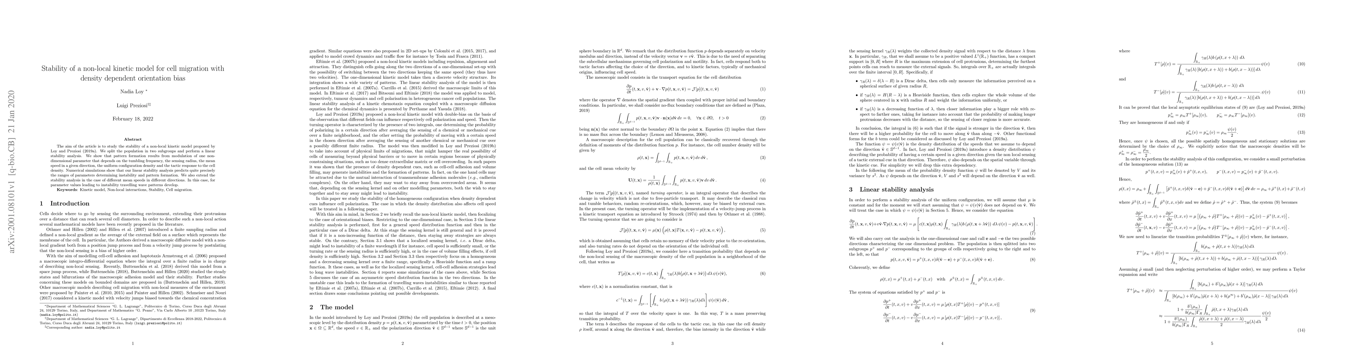 This study investigates the stability of a non-local kinetic model for cell migration with density-dependent orientation bias, finding that pattern formation occurs due to modulation of one key parameter related to tumbling frequency and cell density.