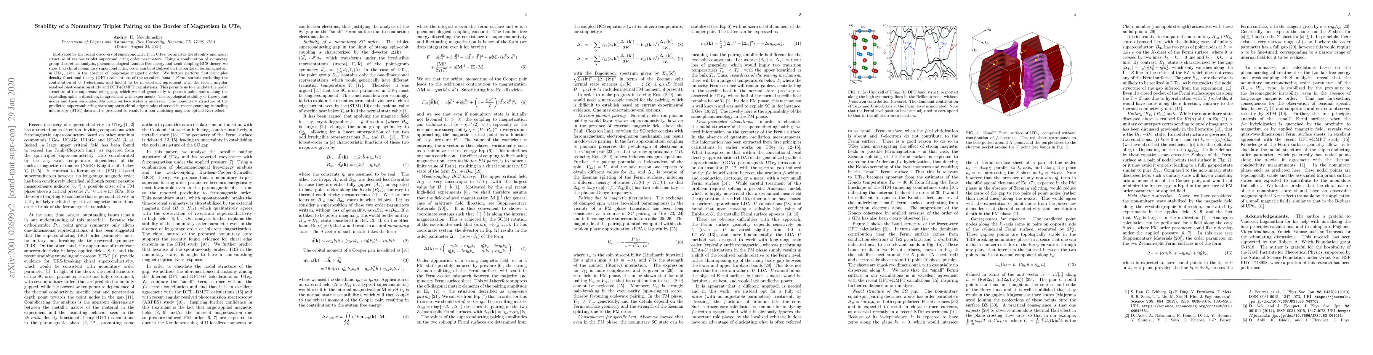 This paper investigates the stability of chiral nonunitary triplet pairing in UTe$_2$ near the boundary of ferromagnetism, demonstrating its viability via symmetry analysis and weak-coupling BCS theory. The predicted nodal structure of the superconducting gap, featuring point nodes along the $a$ direction, aligns with experimental observations and supports the existence of Majorana surface states.