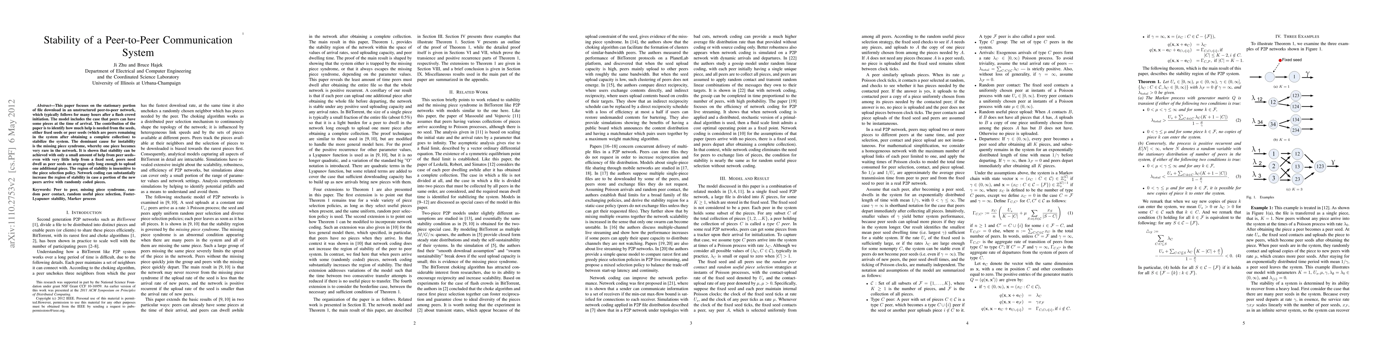 This paper focuses on the stationary portion of file download in an unstructured peer-to-peer network, which typically follows for many hours after a flash crowd initiation. The model includes the case that peers can have some pieces at the time of arrival. The contribution of the paper is to identify how much help is needed from the seeds, either fixed seeds or peer seeds (which are peers remaining in the system after obtaining a complete collection) to stabilize the system. The dominant cause for instability is the missing piece syndrome, whereby one piece becomes very rare in the network. It is shown that stability can be achieved with only a small amount of help from peer seeds--even with very little help from a fixed seed, peers need dwell as peer seeds on average only long enough to upload one additional piece. The region of stability is insensitive to the piece selection policy. Network coding can substantially increase the region of stability in case a portion of the new peers arrive with randomly coded pieces.