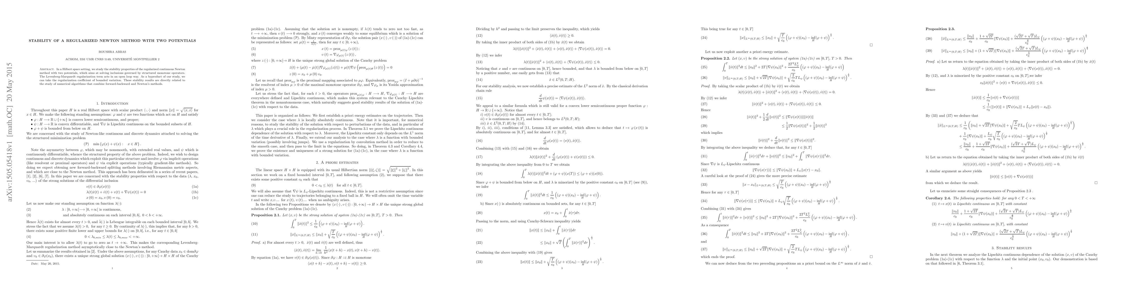 This paper investigates the stability of a regularized Newton method with two potentials in solving inclusions governed by structured monotone operators. It establishes bounds on the regularization coefficient for stable solutions.
