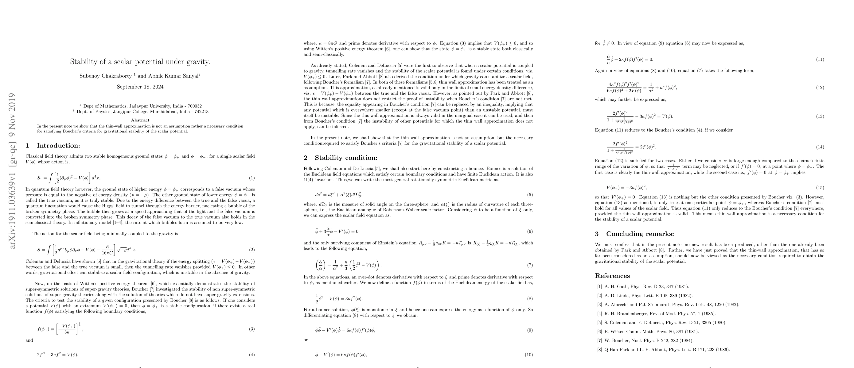Summary: The paper demonstrates that the thin-wall approximation is essential for meeting Boucher's criteria for gravitational stability of scalar potentials, rather than being an arbitrary assumption. This finding underscores the necessity of this approximation in theoretical models.