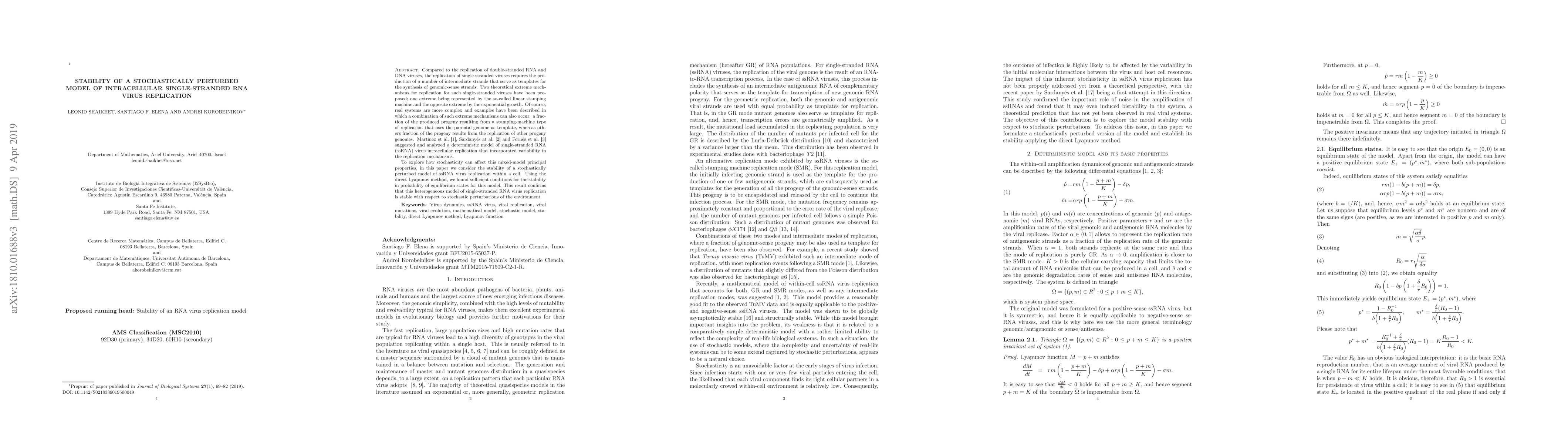 This paper investigates the stability of a stochastically perturbed model of intracellular single-stranded RNA virus replication, confirming its stability in probability using the direct Lyapunov method. The study highlights the model's robustness against environmental stochasticity, despite the variability in replication mechanisms.