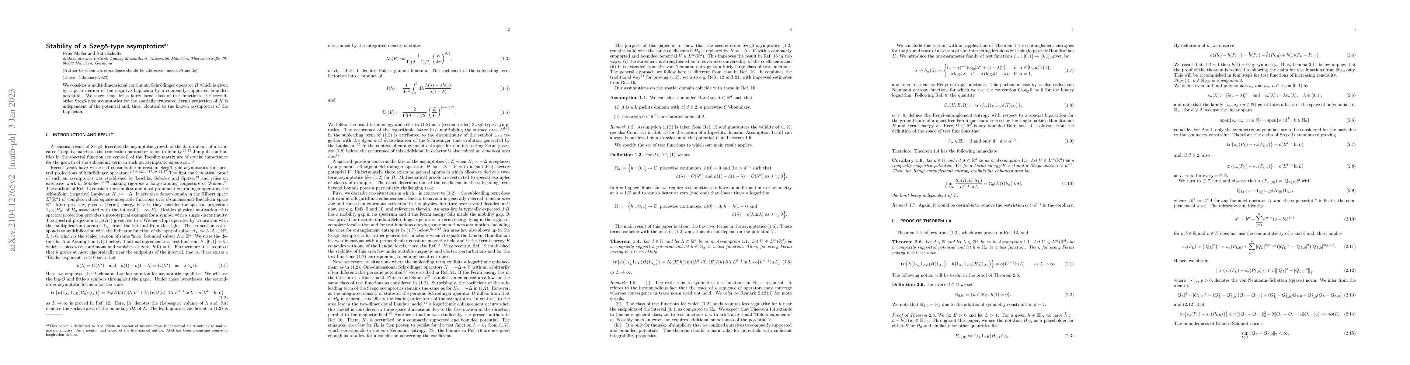 This paper demonstrates that the second-order Szegő-type asymptotics for a multi-dimensional Schrödinger operator, perturbed by a compactly supported potential, remains consistent and identical to the Laplacian's asymptotics for a broad class of test functions. The stability of these asymptotics is shown to be independent of the specific potential.