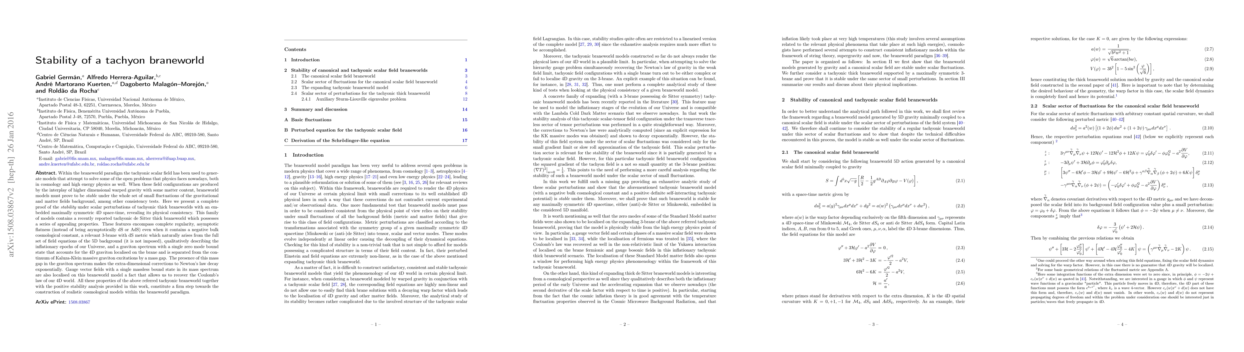 This paper proves the stability under scalar perturbations of tachyonic thick braneworlds, demonstrating their physical consistency and revealing appealing properties such as regularity, asymptotic flatness, and a localized 4D graviton spectrum. These features support the construction of realistic cosmological models within the braneworld paradigm.