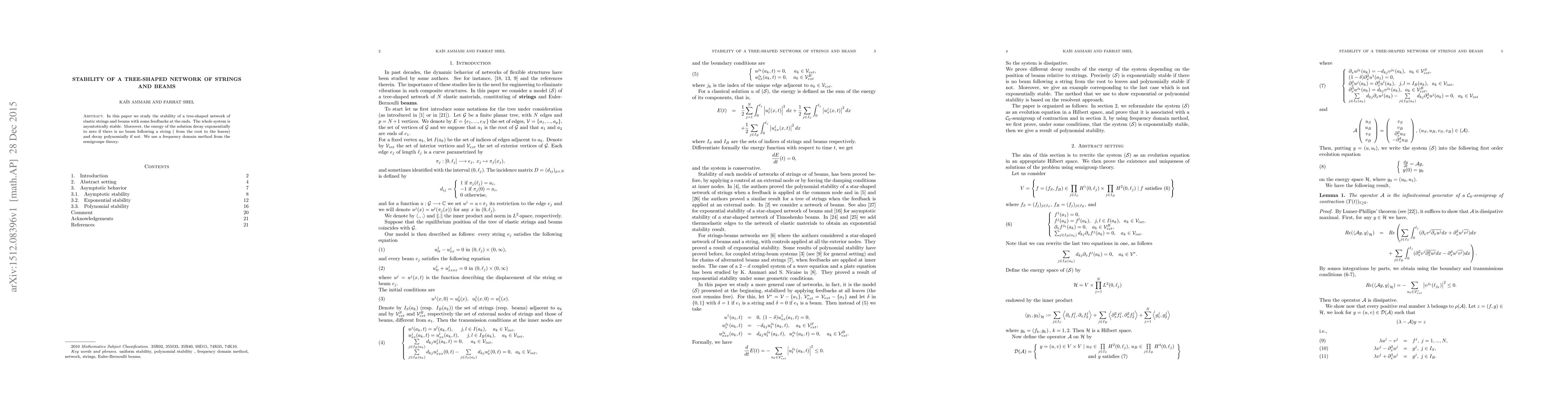 In this paper we study the stability of a tree-shaped network of elastic strings and beams with some feedbacks at the ends. The whole system is asymptotically stable. Moreover, the energy of the solution decay exponentially to zero if there is no beam following a string ( from the root to the leaves) and decay polynomially if not. We use a frequency domain method from the semigroups theory.