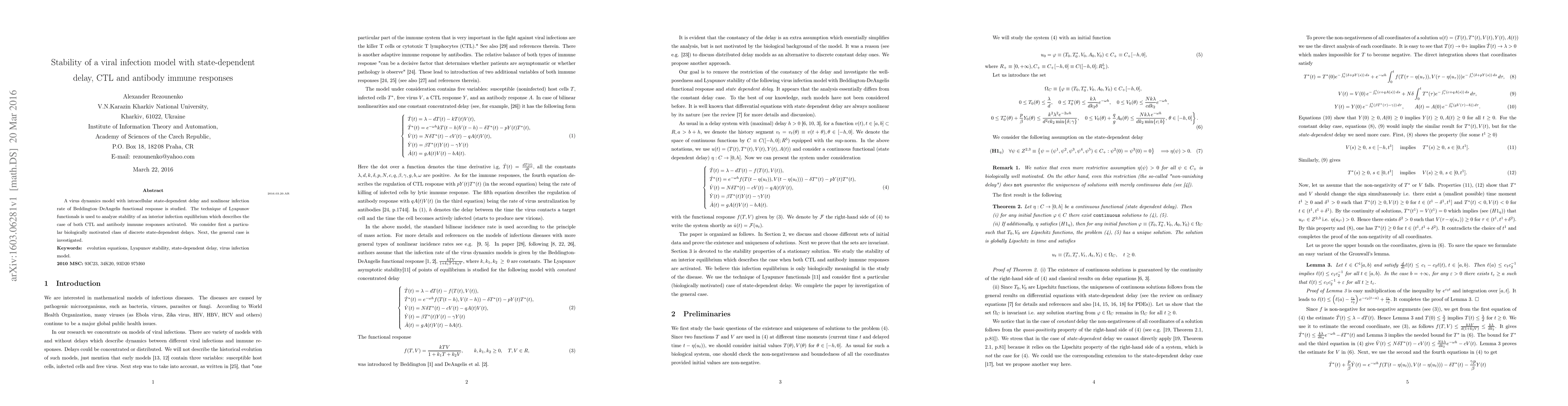 Summary: This research examines a viral infection model incorporating state-dependent delays and Beddington-DeAngelis functional response, analyzing stability using Lyapunov functionals for both CTL and antibody immune responses. It first focuses on a specific class of discrete delays before exploring the general case.