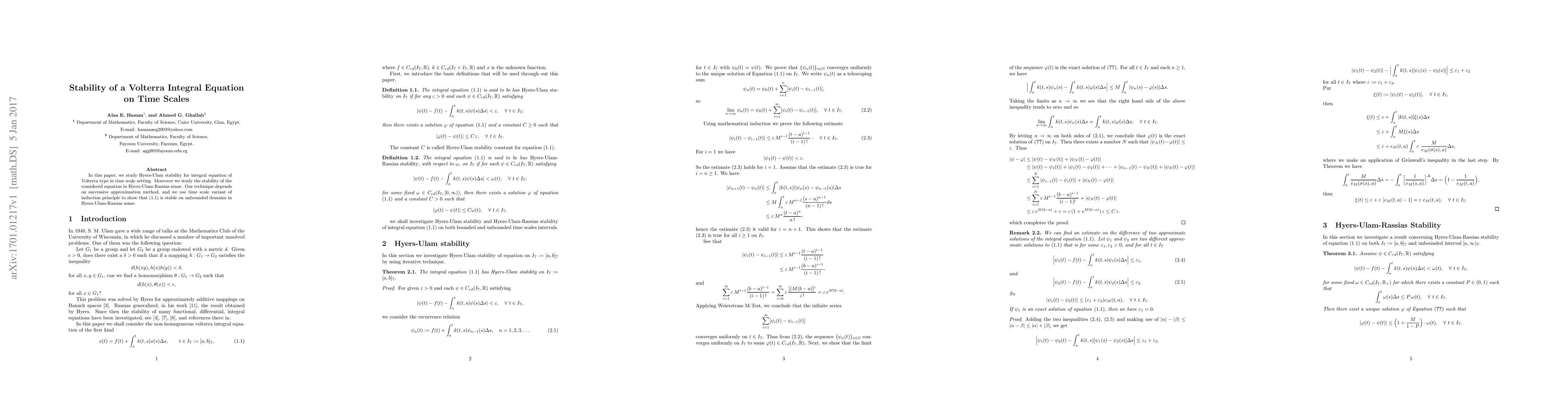 This paper investigates Hyers-Ulam stability for a Volterra integral equation within the framework of time scales, employing a successive approximation method. The authors demonstrate the stability of the equation in the Hyers-Ulam-Rassias sense using a time scale variant of the induction principle.