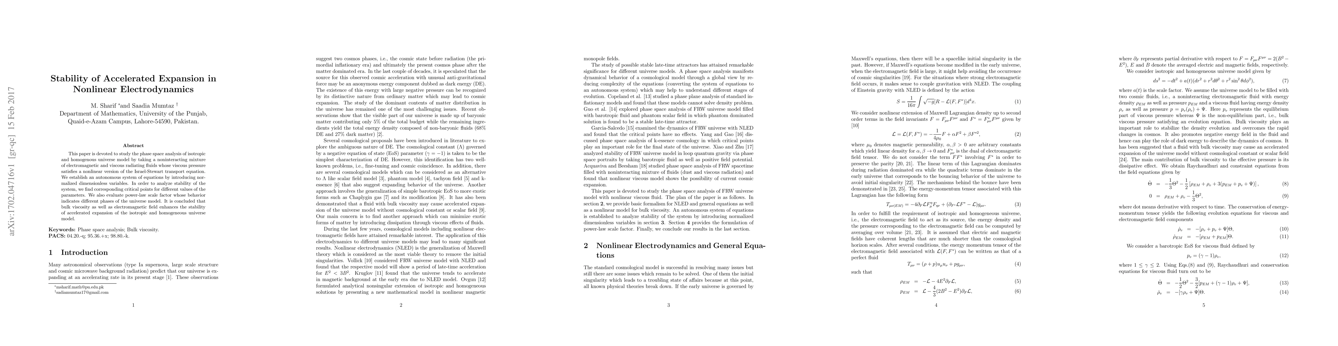 This paper investigates the stability of accelerated expansion in a universe model with electromagnetic and viscous fluids, using phase space analysis and nonlinear electrodynamics. It concludes that bulk viscosity and electromagnetic fields enhance the stability of the accelerated expansion.