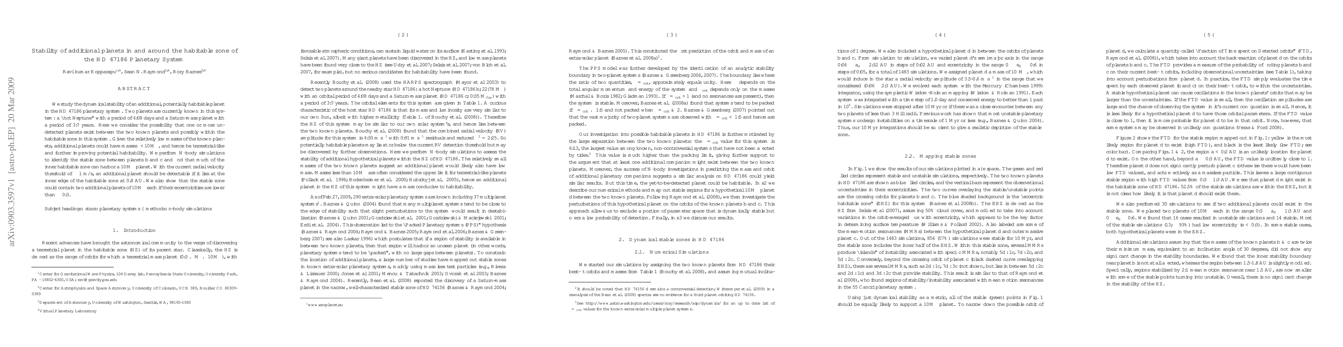 This study investigates the dynamical stability of potential additional planets in the HD 47186 system, focusing on the habitable zone. The simulations suggest that a terrestrial-like planet of around 10 Earth masses could exist within the habitable zone, with the possibility of two such planets if their eccentricities remain below 0.3.