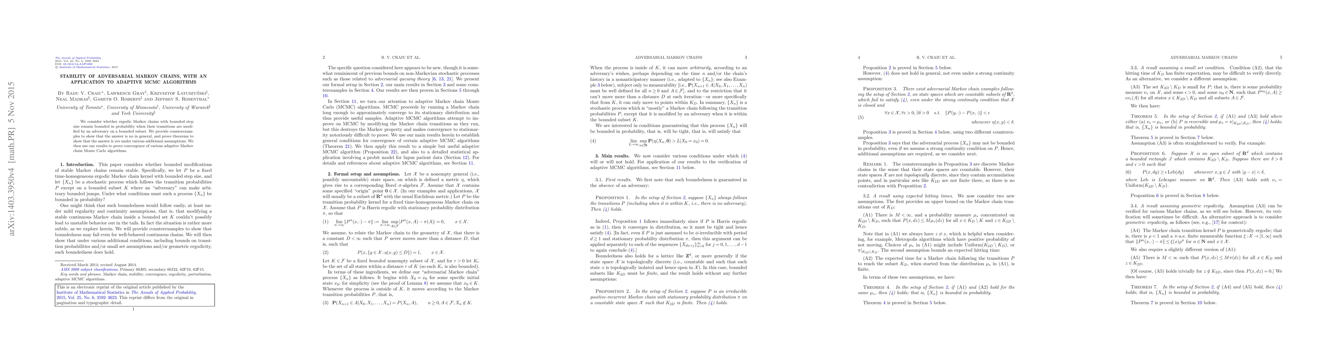 This paper investigates the stability of Markov chains under adversarial modifications and its application to adaptive MCMC algorithms, finding conditions under which stability is preserved.