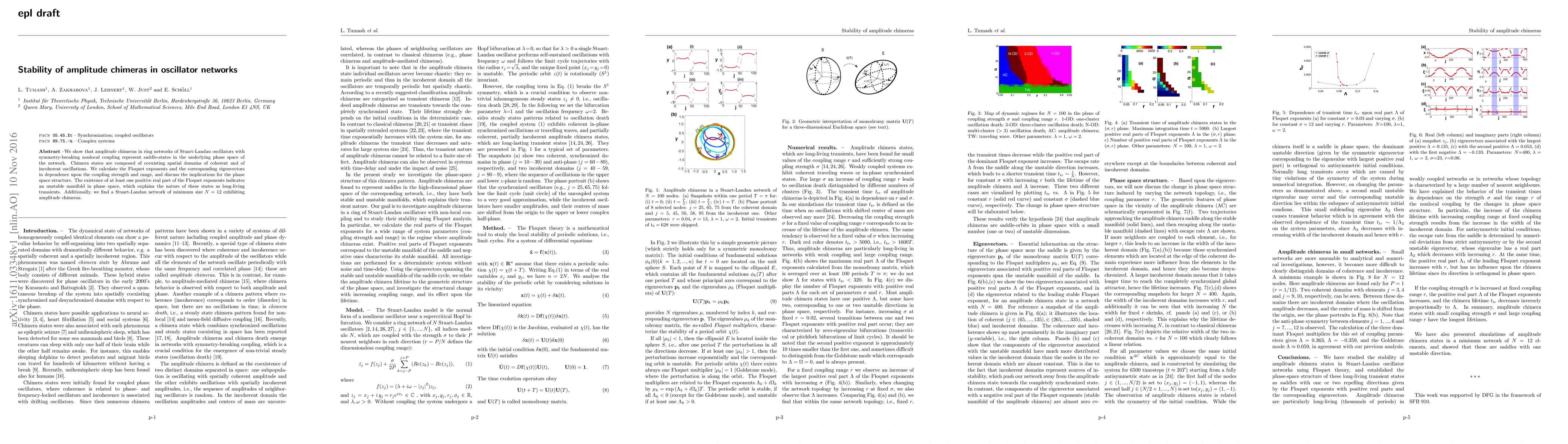 We show that amplitude chimeras in ring networks of Stuart-Landau oscillators with symmetry-breaking nonlocal coupling represent saddle-states in the underlying phase space of the network. Chimera states are composed of coexisting spatial domains of coherent and of incoherent oscillations. We calculate the Floquet exponents and the corresponding eigenvectors in dependence upon the coupling strength and range, and discuss the implications for the phase space structure. The existence of at least one positive real part of the Floquet exponents indicates an unstable manifold in phase space, which explains the nature of these states as long-living transients. Additionally, we find a Stuart-Landau network of minimum size $N=12$ exhibiting amplitude chimeras