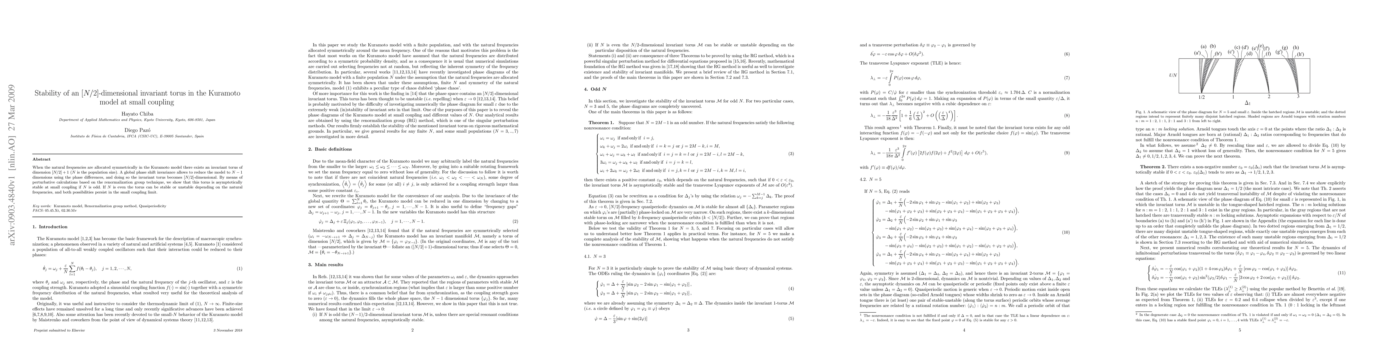 When the natural frequencies are allocated symmetrically in the Kuramoto model there exists an invariant torus of dimension [N/2]+1 (N is the population size). A global phase shift invariance allows to reduce the model to $N-1$ dimensions using the phase differences, and doing so the invariant torus becomes [N/2]-dimensional. By means of perturbative calculations based on the renormalization group technique, we show that this torus is asymptotically stable at small coupling if N is odd. If N is even the torus can be stable or unstable depending on the natural frequencies, and both possibilities persist in the small coupling limit.