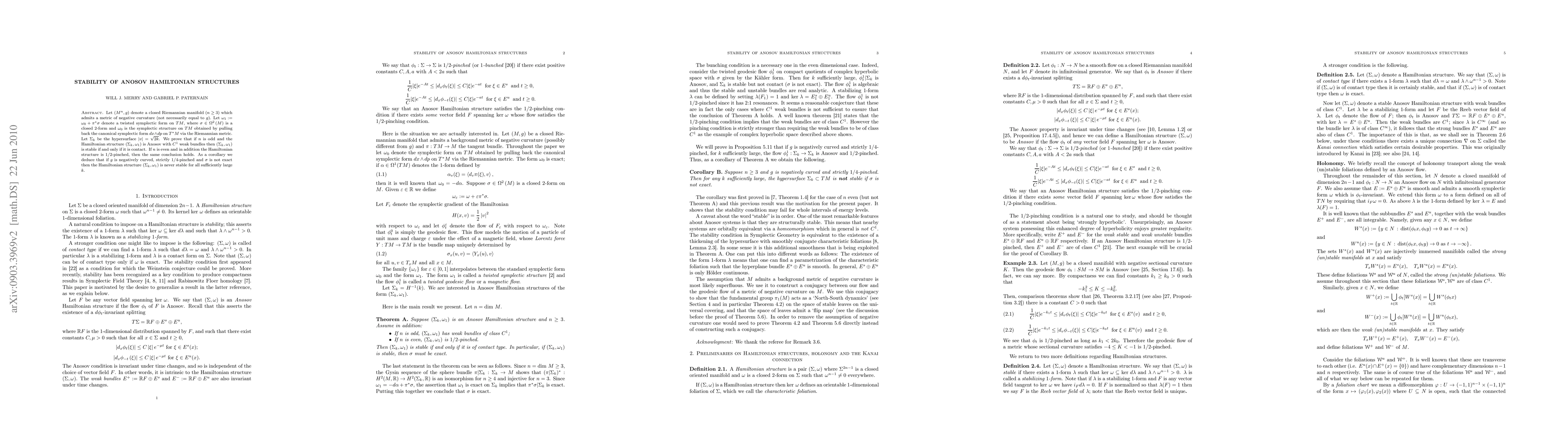Consider the tangent bundle of a Riemannian manifold $(M,g)$ of dimension $n\geq3$ admitting a metric of negative curvature (not necessarily equal to $g$) endowed with a twisted symplectic structure defined by a closed 2-form on $M$. We consider the Hamiltonian flow generated (with respect to that symplectic structure) by the standard kinetic energy Hamiltonian, and we consider a compact regular energy level $\Sigma_{k}:=H^{-1}(k)$ of $H$. Suppose $\Sigma_{k}$ is an Anosov energy level. We prove that if $n$ is odd, then if the Hamiltonian flow restricted to $\Sigma_{k}$ is Anosov with $C^{1}$ weak bundles then the Hamiltonian structure $(\Sigma_{k}$ is stable if and only if it is contact. If $n$ is even and in addition the flow is assumed to be 1/2-pinched then the same conclusion holds. As a corollary we deduce that if $g$ is negatively curved, strictly 1/4-pinched and the 2-form defining the twisted symplectic structure is not exact then the Hamiltonian structure $(\Sigma_{k}$ is never stable for all sufficiently large $k$.