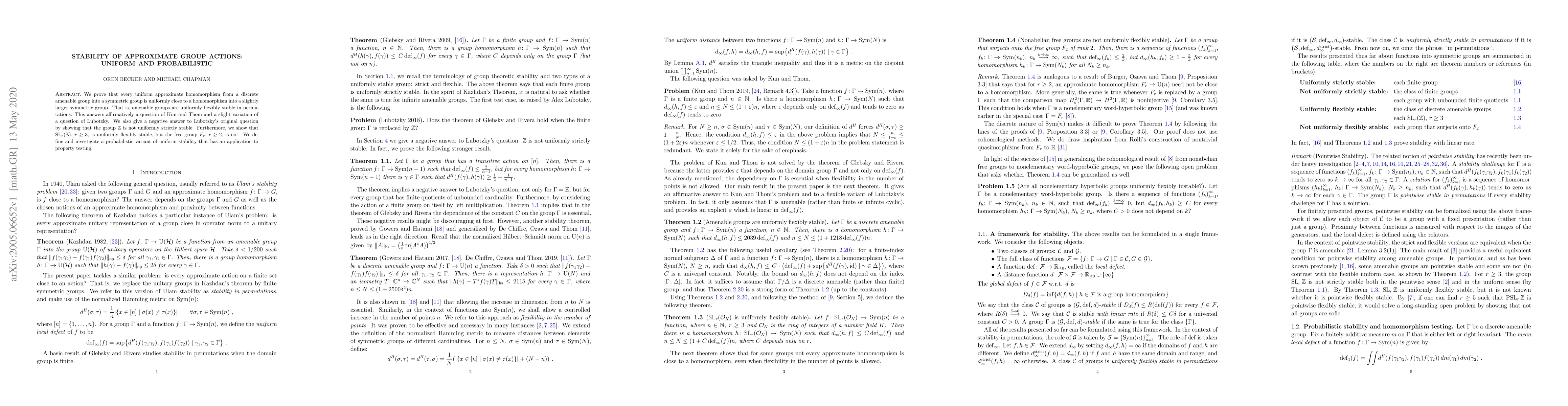 We prove that every uniform approximate homomorphism from a discrete amenable group into a symmetric group is uniformly close to a homomorphism into a slightly larger symmetric group. That is, amenable groups are uniformly flexibly stable in permutations. This answers affirmatively a question of Kun and Thom and a slight variation of a question of Lubotzky. We also give a negative answer to Lubotzky's original question by showing that the group $\mathbb{Z}$ is not uniformly strictly stable. Furthermore, we show that $\text{SL}_{r}(\mathbb{Z})$, $r\geq3$, is uniformly flexibly stable, but the free group $F_{r}$, $r\geq 2$, is not. We define and investigate a probabilistic variant of uniform stability that has an application to property testing.