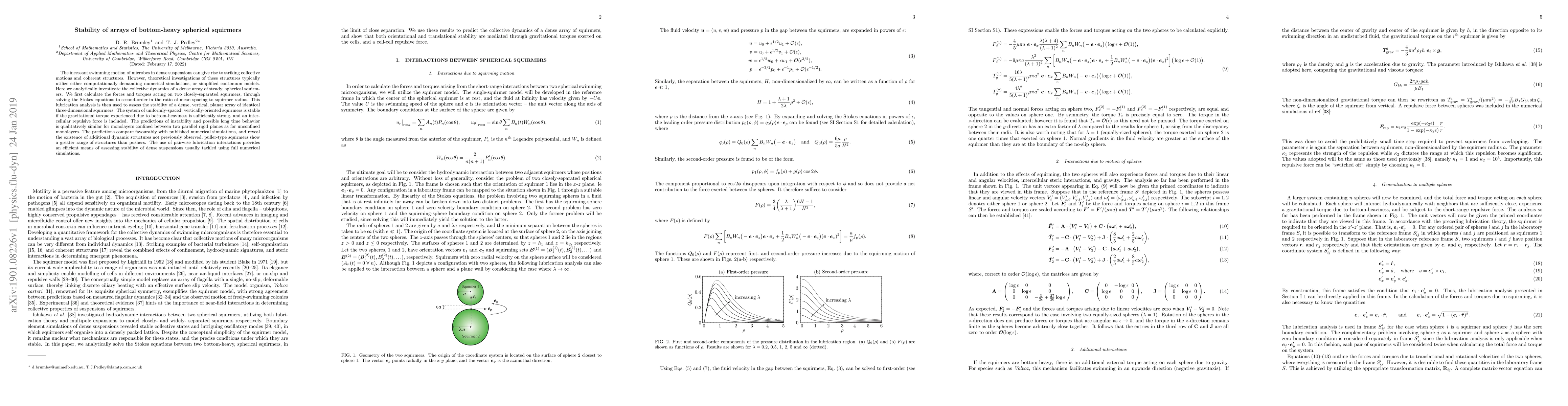 Researchers analyzed the collective dynamics of dense arrays of spherical squirmers, finding that stability depends on gravitational torque and intercellular repulsive forces, with pusher-type squirmers showing more diverse structures.